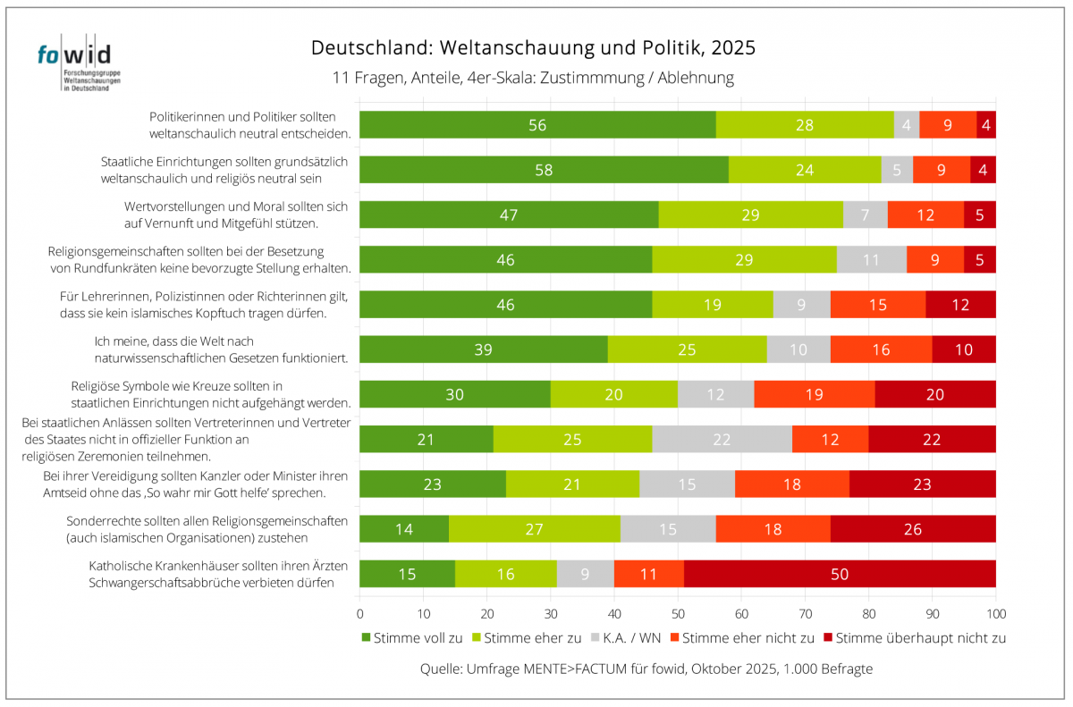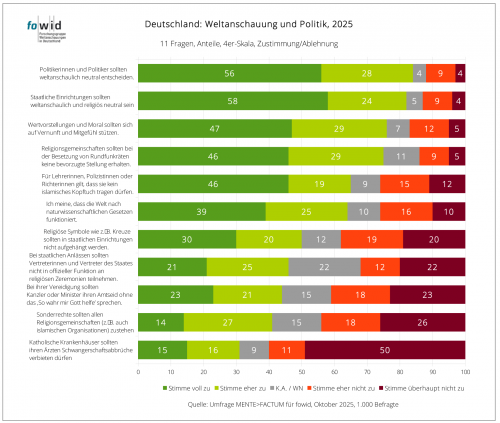 Die überwältigende Mehrheit der Bürgerinnen und Bürger spricht sich für einen „weltanschaulich neutralen Staat“ aus, in dem keine Religions- oder Weltanschauungsgemeinschaft privilegiert oder diskriminiert wird. So vertreten 84 Prozent der Befragten die Auffassung, Politikerinnen und Politiker sollten „ihre Entscheidungen nicht auf ihre persönlichen religiösen Überzeugungen stützen“, sondern sich „weltanschaulich neutral entscheiden“. 82 Prozent votieren dafür, dass „staatliche Einrichtungen wie Gerichte, Schulen oder Polizei grundsätzlich weltanschaulich und religiös neutral“ sein sollten. 75 Prozent meinen, dass Religionsgemeinschaften bei der Besetzung von Rundfunkräten „keine bevorzugte Stellung erhalten“ sollten. 65 Prozent sprechen sich gegen das islamische Kopftuch von Lehrerinnen in öffentlichen Schulen aus und 61 Prozent lehnen es ab, dass die katholische Kirche weiterhin medizinisch indizierte Schwangerschaftsabbrüche in ihren Kliniken verbieten darf.