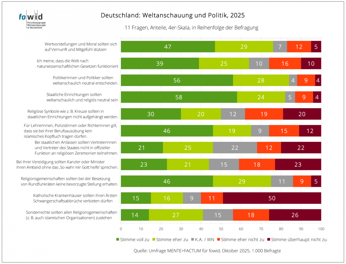 Die Umfrage wurde Anfang Oktober 2025 von dem Markt- und Meinungsforschungsinstitut „MENTE>FACTUM“ durchgeführt. Die Verantwortung lag bei Klaus-Peter Schöppner, der mehr als 20 Jahre das „Emnid-Institut“ leitete (2014 mit „TNS Infratest“ verschmolzen). Die Items der Studie wurden von der „Forschungsgruppe Weltanschauungen in Deutschland“ in Kooperation mit Klaus-Peter Schöppner formuliert. Die Umfrage mit 1.000 Teilnehmerinnen und Teilnehmern ist repräsentativ für die Wohnbevölkerung ab 16 Jahren. Durchgeführt wurde die Studie in Form einer Onlinebefragung. Dieses Design wurde u.a. deshalb gewählt, weil die erhobenen Items recht komplex und daher schriftlich besser zu verstehen und zu beantworten sind als im Rahmen einer Telefonbefragung. Zudem sind die traditionellen Einwände gegen Onlinebefragungen obsolet geworden, da die Bevölkerung (im Unterschied zu den ersten fowid-Umfragen vor 20 Jahren) recht flächendeckend Zugang zum Internet hat. Eine leichte Verzerrung der Ergebnisse wäre allerdings bei der Altersgruppe 60+ denkbar (80-Jährige, die an Online-Umfragen teilnehmen, sind vermutlich innovationsfreudiger, säkularer und verfügen über einen höheren Bildungsgrad als der Durchschnitt ihrer Alterskohorte).