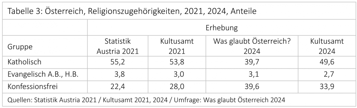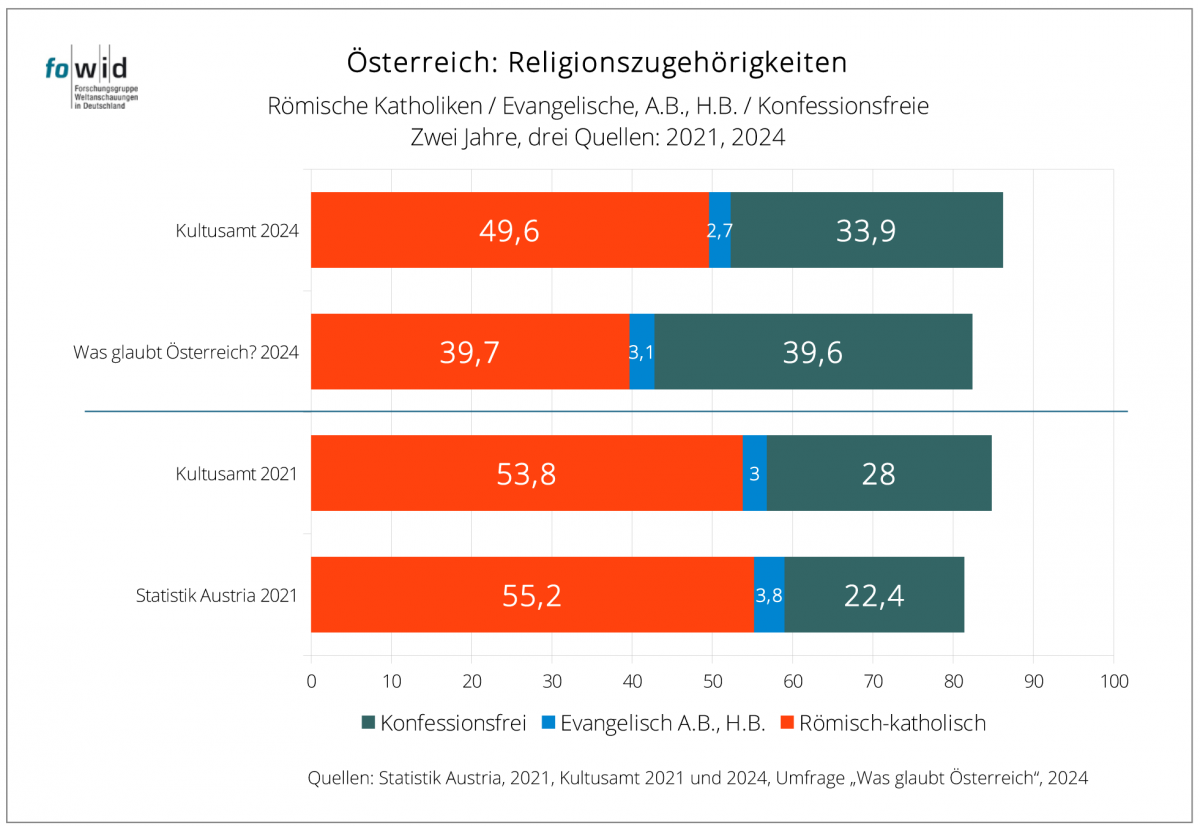 Fowid-Statistikbeobachter: 2021 und 2024 haben zwei groß angelegte Erhebungen in Österreich versucht, Daten zur offiziellen konfessionellen Zuordnung der Bevölkerung zu erhalten. Sie haben mit unterschiedlichen Fragestellungen unterschiedliche Resultate bekommen, die ihrerseits von offiziellen Zahlen abweichen und die Methode insgesamt in Frage stellen.