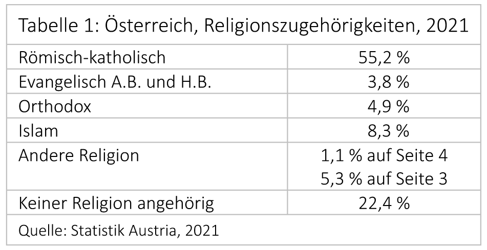 Die letzte Volkszählung, in der nach dem Religionsbekenntnis gefragt wurde, war 2001. Danach hat Österreich auf die „Registerzählung“, die Zusammenführung von Daten aus verschiedenen staatlichen Quellen umgestellt. Und das Religionsbekenntnis ist zwar im Meldewesen erfasst, aber es bleibt auch dort. Solange etwa Religionsaustritte nicht an die Meldebehörden weitergeleitet werden, was derzeit nicht vorgesehen ist, wären die Meldedaten auch nicht zuverlässig.