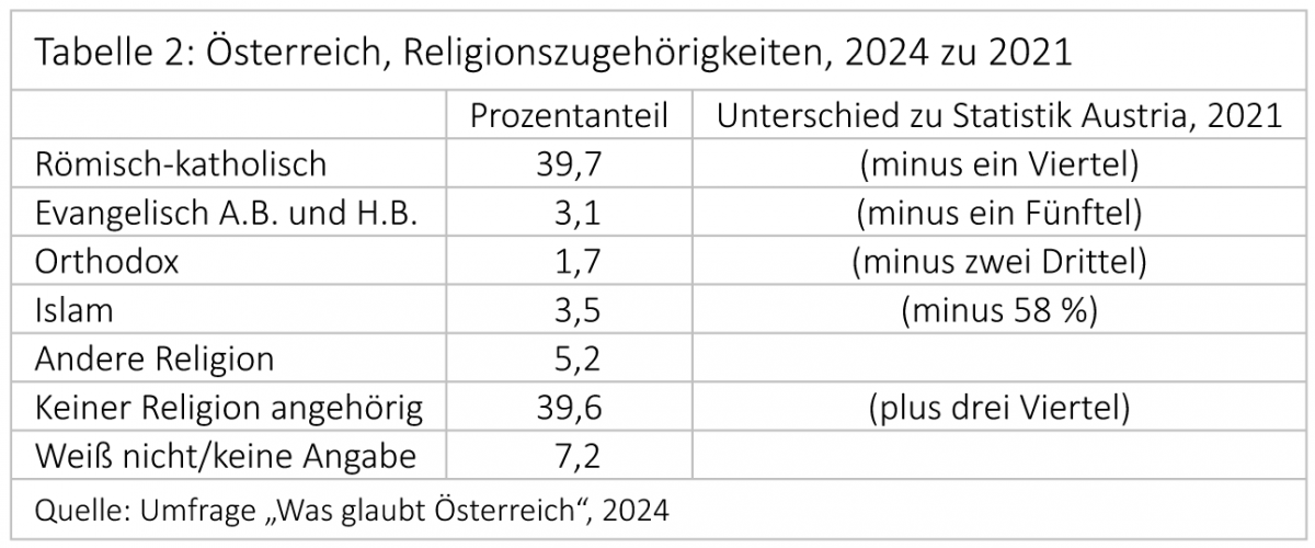 Natürlich muss die Statistik-Austria-Erhebung aus 2021 mit den Zahlen des Jahres 2021 verglichen werden, und „Was glaubt Österreich?“ mit 2024.