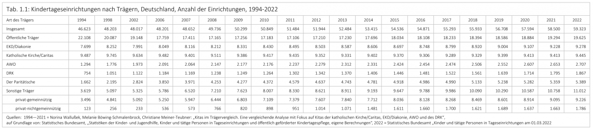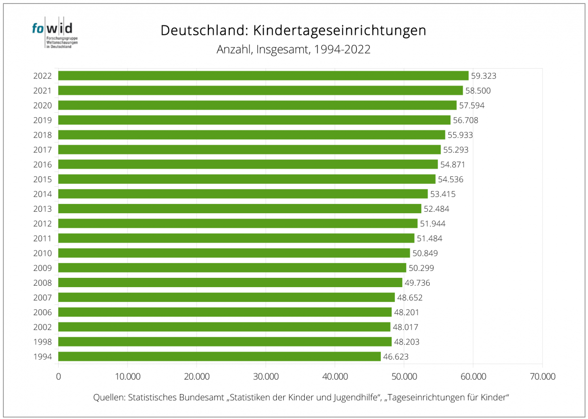 Im betrachteten Zeitraum von 1994 – 2022, rund dreißig Jahre, hat sich die Anzahl der Kindertageseinrichtungen stetig erhöht: Von rund 47.000 auf 59.000 Kitas. (s. Tabelle 1 im Anschluss des Textes.)