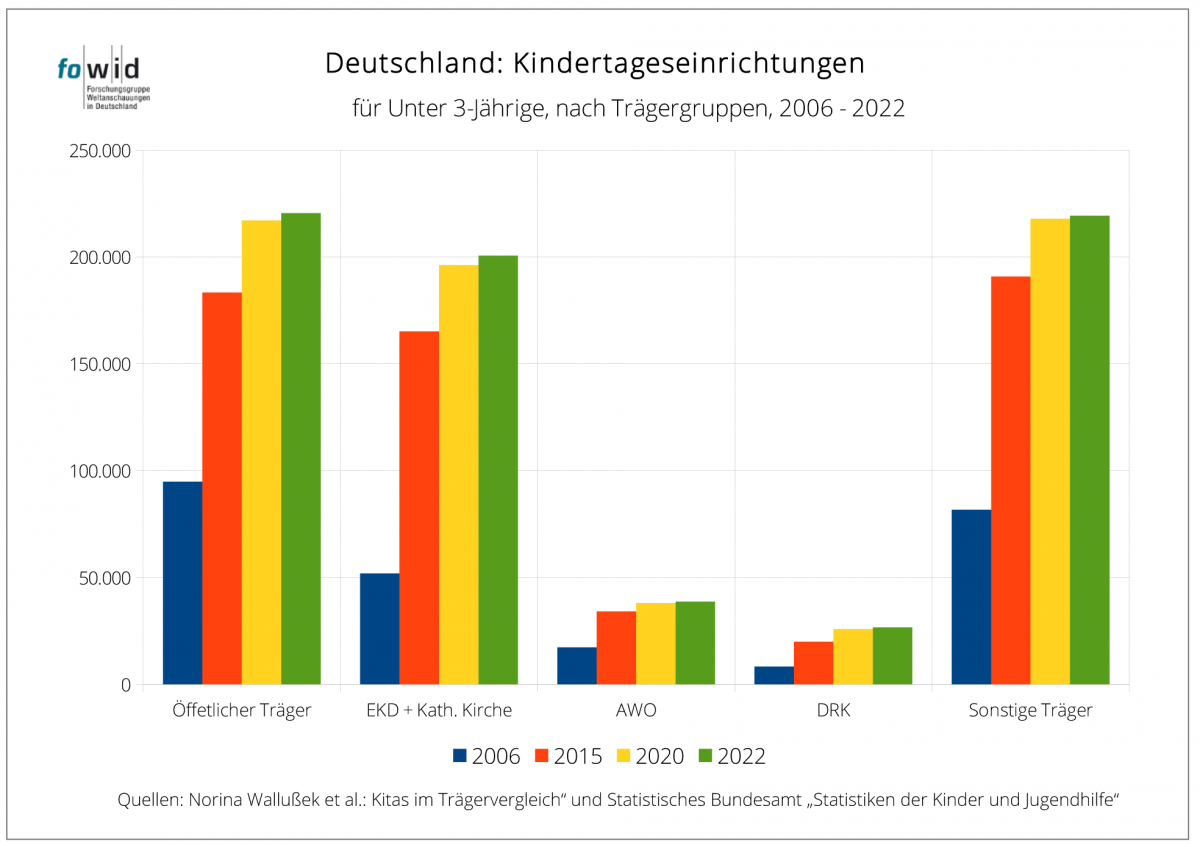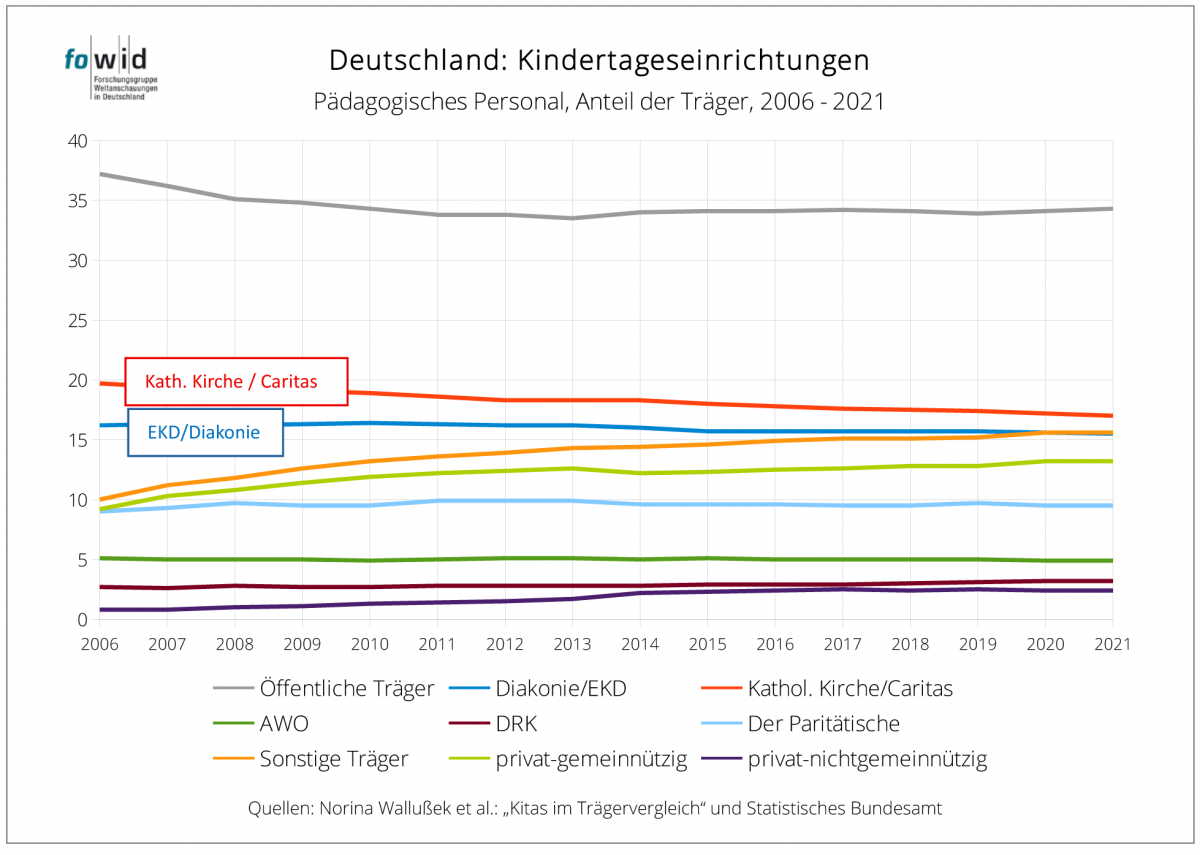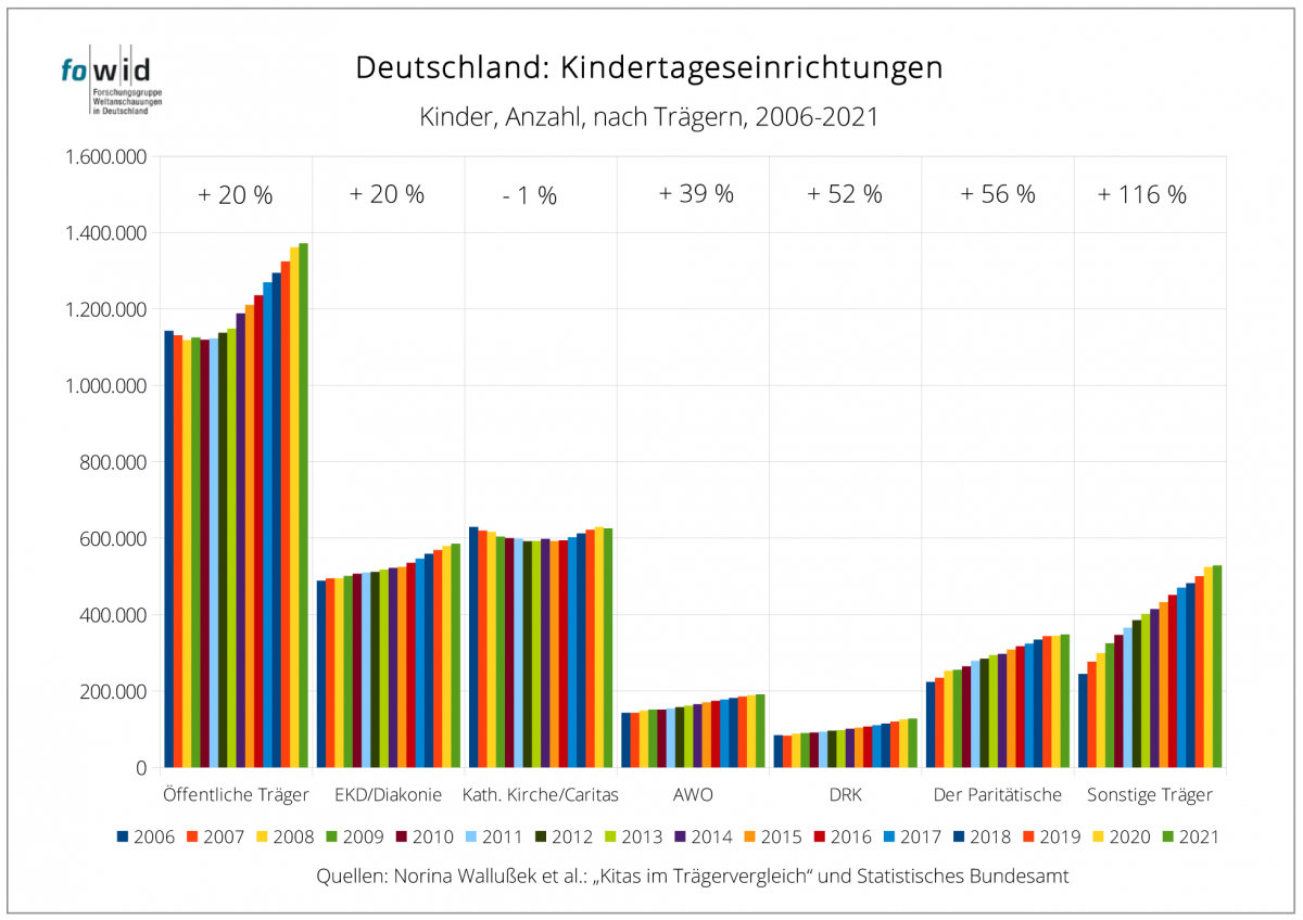 Diese Ausarbeitung ist die Aktualisierung der Recherche zu „Caritas und Diakonie“ und des fowid-Artikels „Kindertagesstätten öffentlicher und freier Träger 2017“. Datenbasis sind die Daten des Statistischen Bundesamtes, auf denen auch die detaillierten Aufbereitungen und Analysen der Publikation von Norina Wallußek, Melanie Böwing-Schmalenbrock, Christiane Meiner-Teubner beruhen: „Kitas im Trägervergleich. Eine vergleichende Analyse mit Fokus auf Kitas der katholischen Kirche/Caritas, EKD/Diakonie, AWO und des DRK“.