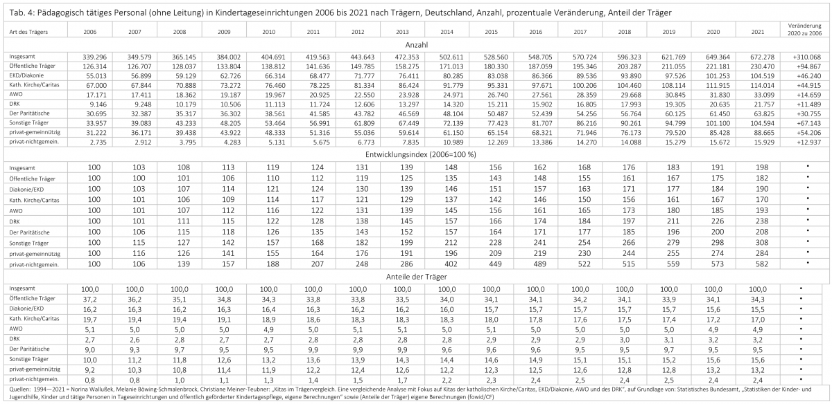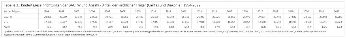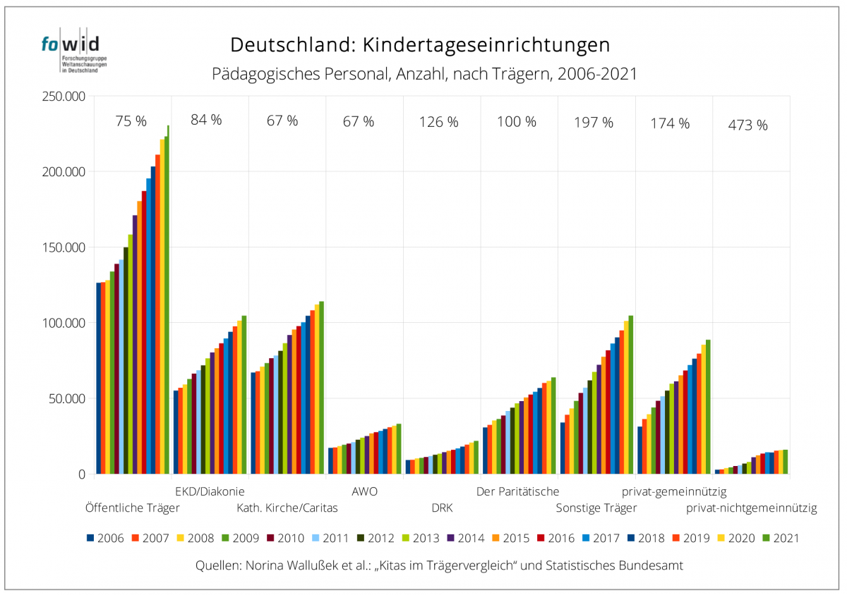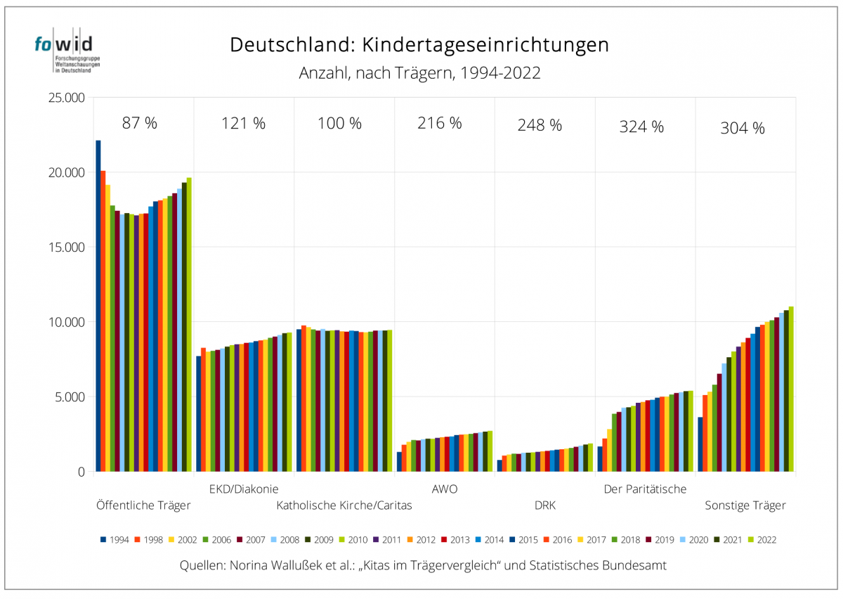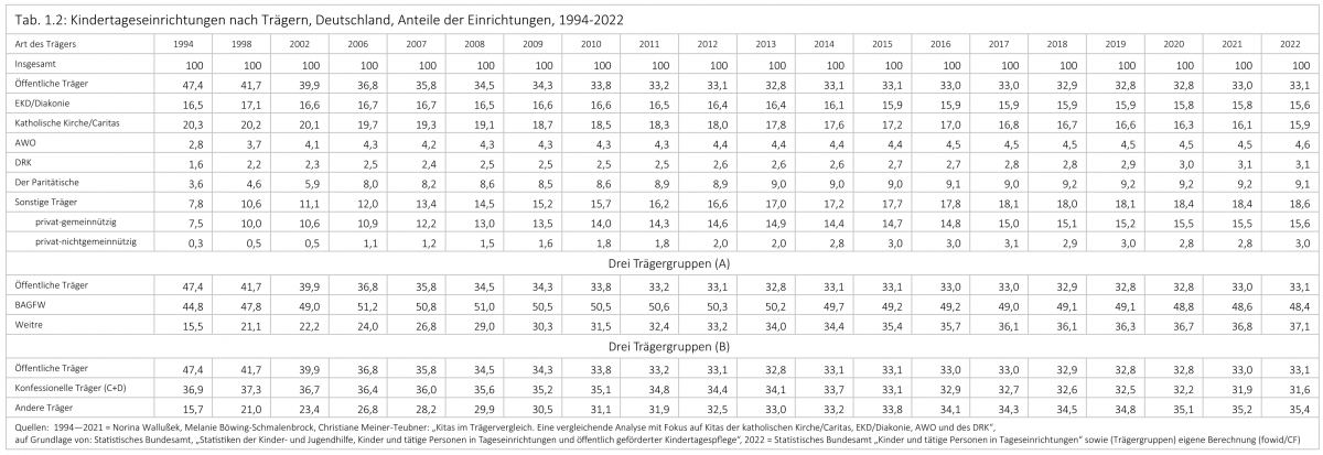 Diese Ausarbeitung ist die Aktualisierung der Recherche zu „Caritas und Diakonie“ und des fowid-Artikels „Kindertagesstätten öffentlicher und freier Träger 2017“. Datenbasis sind die Daten des Statistischen Bundesamtes, auf denen auch die detaillierten Aufbereitungen und Analysen der Publikation von Norina Wallußek, Melanie Böwing-Schmalenbrock, Christiane Meiner-Teubner beruhen: „Kitas im Trägervergleich. Eine vergleichende Analyse mit Fokus auf Kitas der katholischen Kirche/Caritas, EKD/Diakonie, AWO und des DRK“.