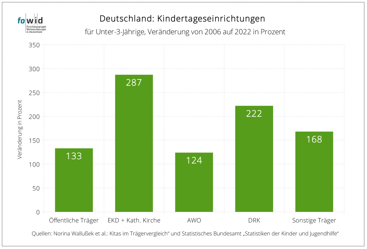 Obwohl sich die Zahl der Kitas der Diakonie von 7.700 auf 9.300 erhöht hat und die Anzahl der Kitas der Caritas (mit rund 9.500) gleich bleibt, verringert sich der Anteil der konfessionellen Träger von 37 auf 32 Prozent. 2025 organisieren drei etwa gleich große Gruppen den Angebotsmarkt der Kitas: der Staat mit 33 Prozent der Einrichtungen, die beiden Kirchen mit 32 Prozent und alle anderen Träger mit 35 Prozent.