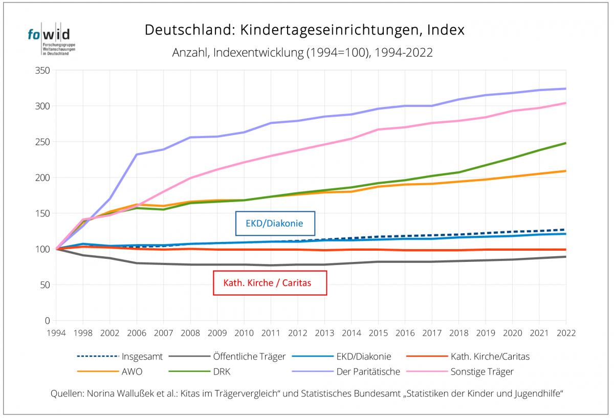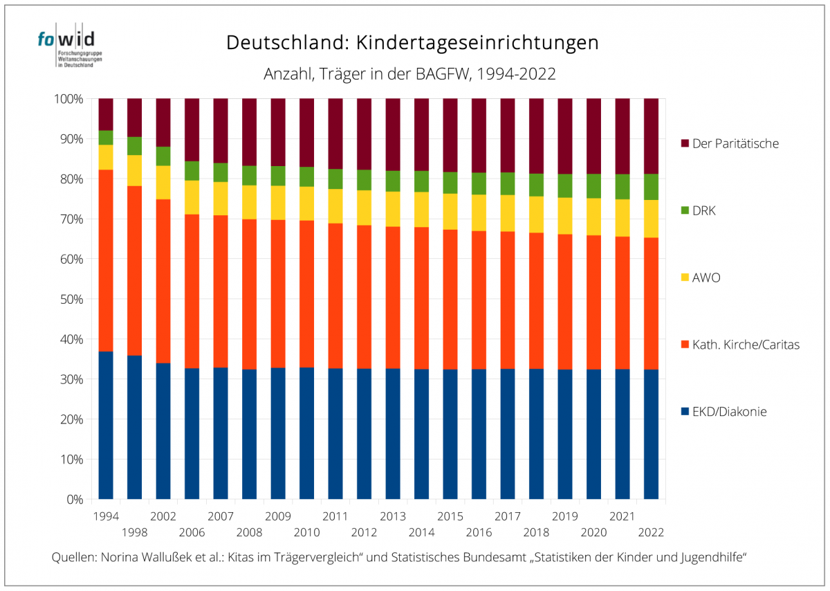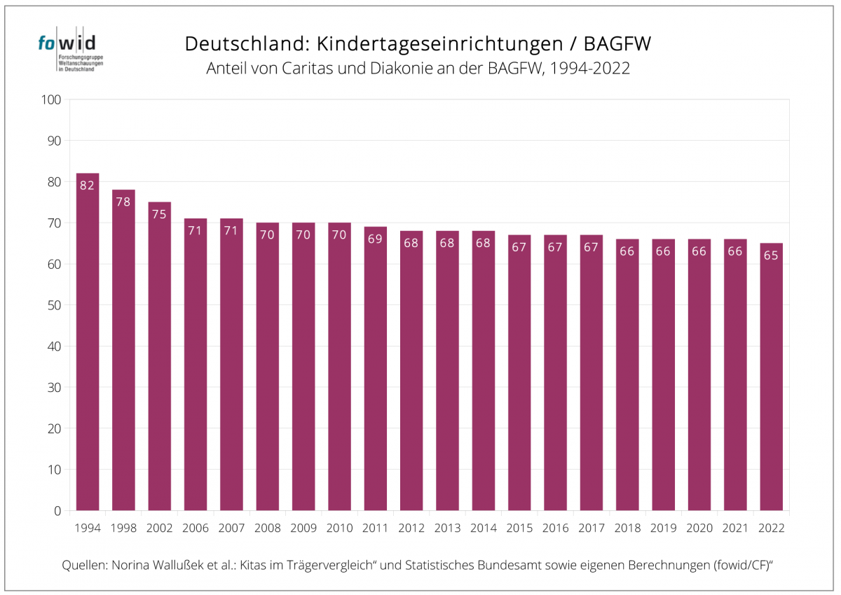 1994 belief sich der Anteil der Kirchenmitglieder in Deutschland auf 69 Prozent der Bevölkerung. 2025 beträgt er noch 44 Prozent. Dieser Rückgang der Mitgliederzahlen hat zu keiner entsprechenden Verringerung der Anzahl der Kindertageseinrichtungen der Kirchen geführt. 1994 waren die Kirchen Träger von 37 Prozent der Kitas, 2025 sind es 32 Prozent – bei steigender Anzahl der Kitas.