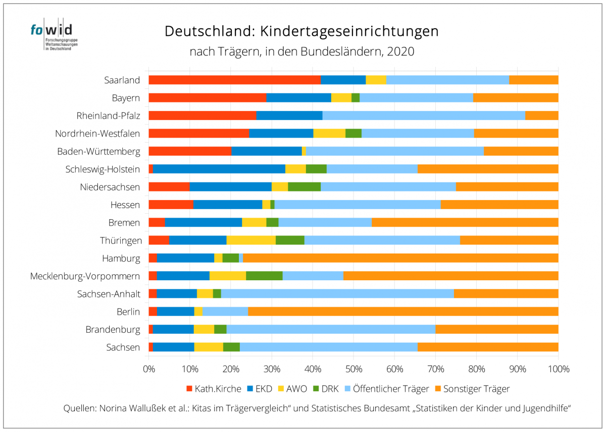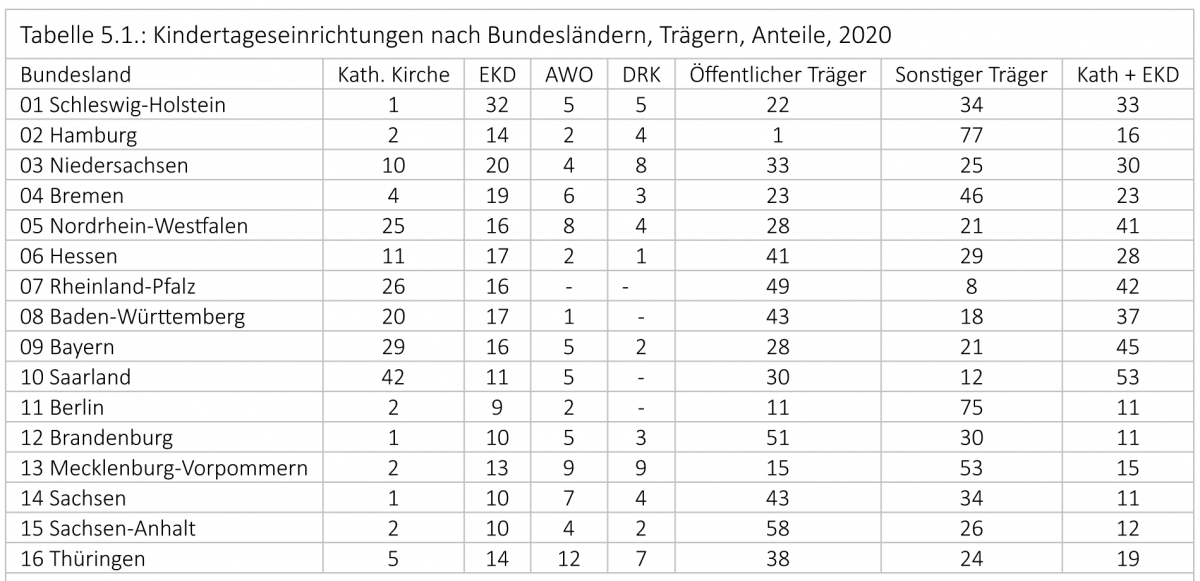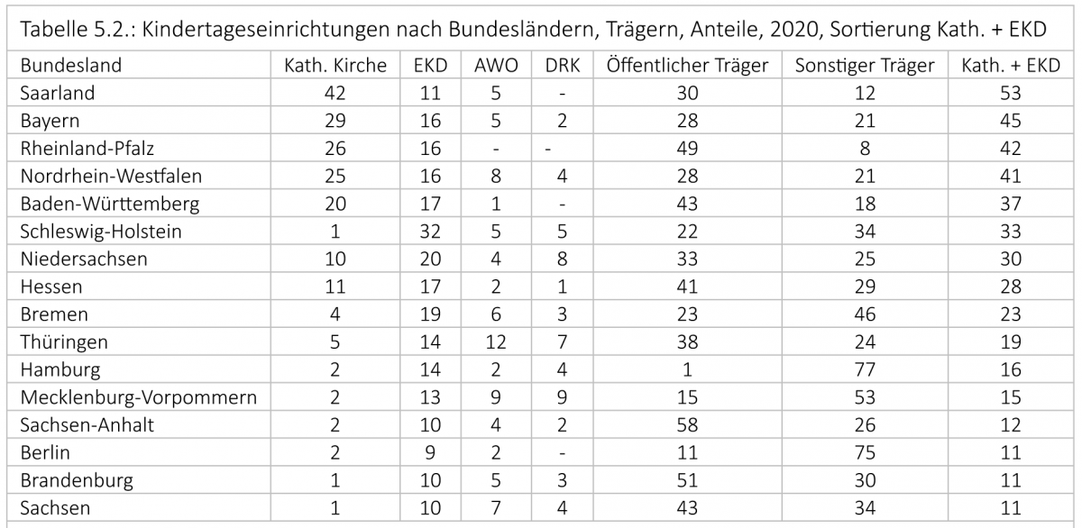 Die Zahlengabe von jeweils rund 16 Prozent der beiden konfessionellen Träger, zusammen 32 Prozent der Kitas, hat mit Bezug auf die Bundesländer eine große Spannweite (s. Tabelle 5). Sie reicht von 53 Prozent kirchlicher Kita-Träger (42 römisch-katholisch, 11 Prozent EKD-Evangelisch) im Saarland, 45 Prozent in Bayern, 42 Prozent in Rheinland-Pfalz, 41 Prozent in Nordrhein-Westfalen und 37 Prozent in Baden-Württemberg bis Berlin, Brandenburg und Sachsen mit jeweils 11 Prozent kirchlicher Träger.