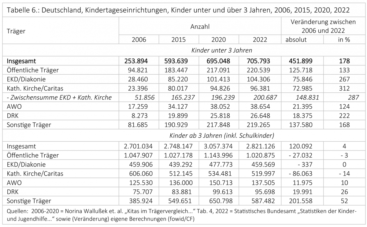 Die hohen Zuwachsarten der kleineren freien Träger bewegt sich auf einem so niedrigen Niveau der Bestandszahlen, dass die Marktposition der kirchlichen Kitas – zumindest in den mittleren und südlichen Bundesländern Westdeutschlands – nicht berührt wird.