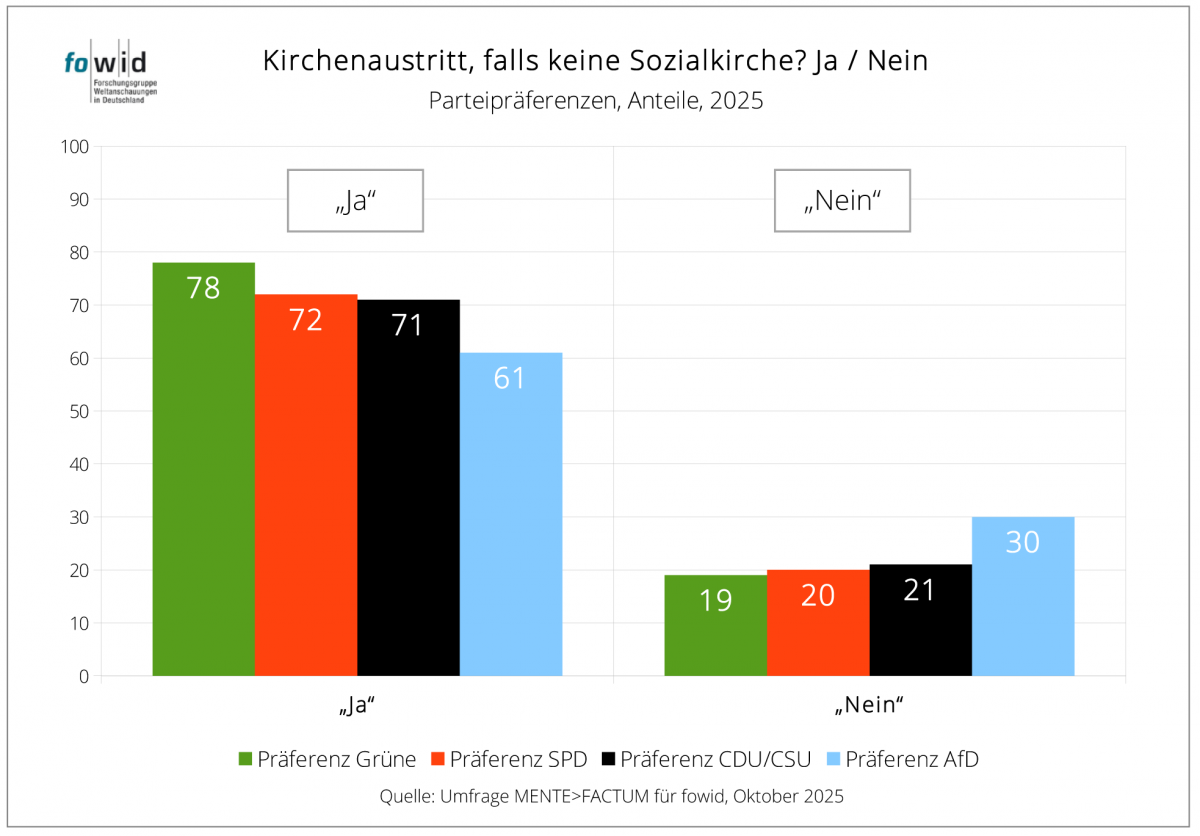 Hinsichtlich der Parteipräferenzen sind es vor allem die Anhänger der Bündnis90/Die Grünen, die eine nur geringe Finanzierung der sozialen Einrichtungen der Kirche aus Kirchengeldern mit Austritten sanktionieren würden.