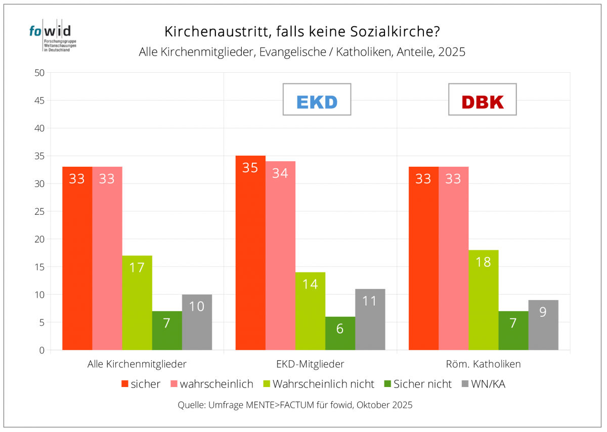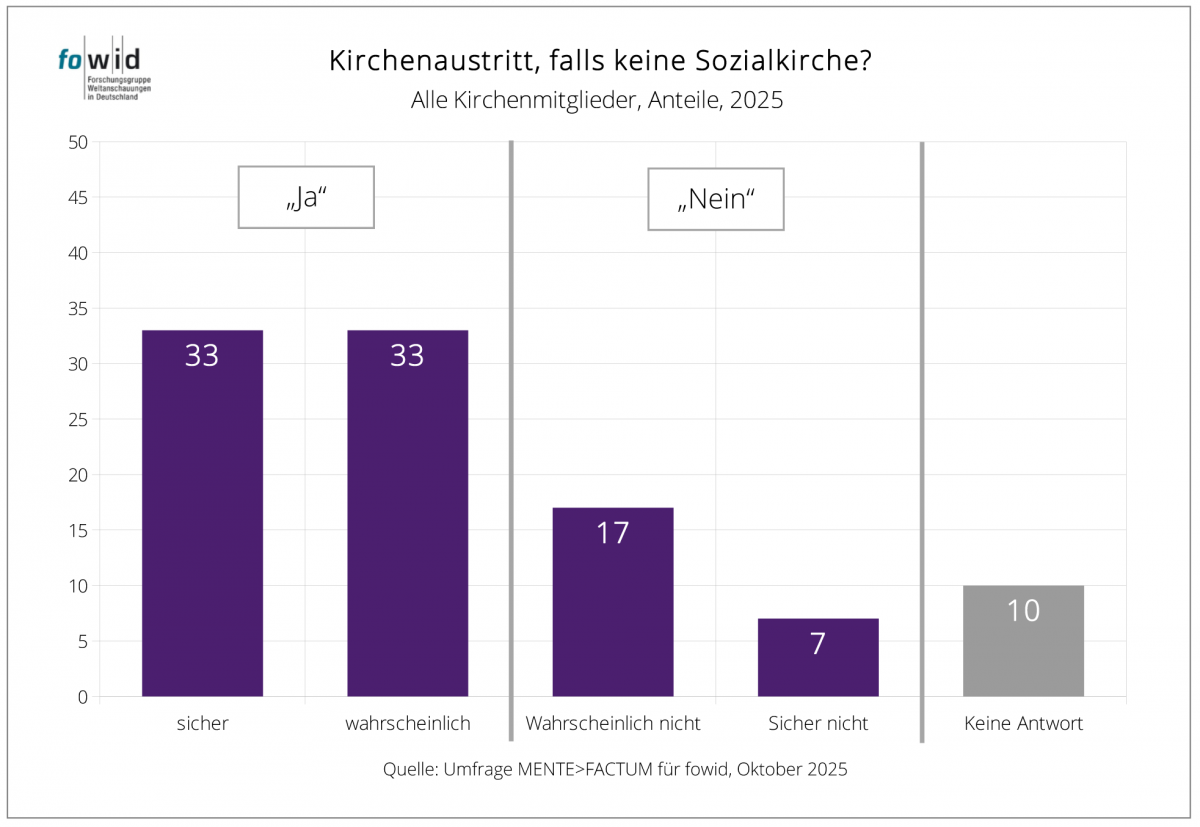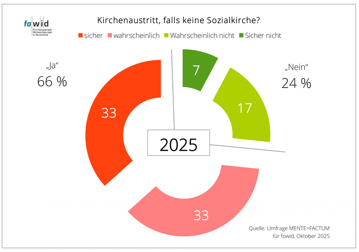 Zwei Drittel der Kirchenmitglieder (66 Prozent) würden 2025 „sicher“ (33 Prozent) bzw. „wahrscheinlich“ (ebenfalls 33 Prozent) aus der Kirche austreten, falls die Kirchen „nur wenig oder fast gar nichts von der Kirchenteuer für soziale Zwecke ausgeben“.