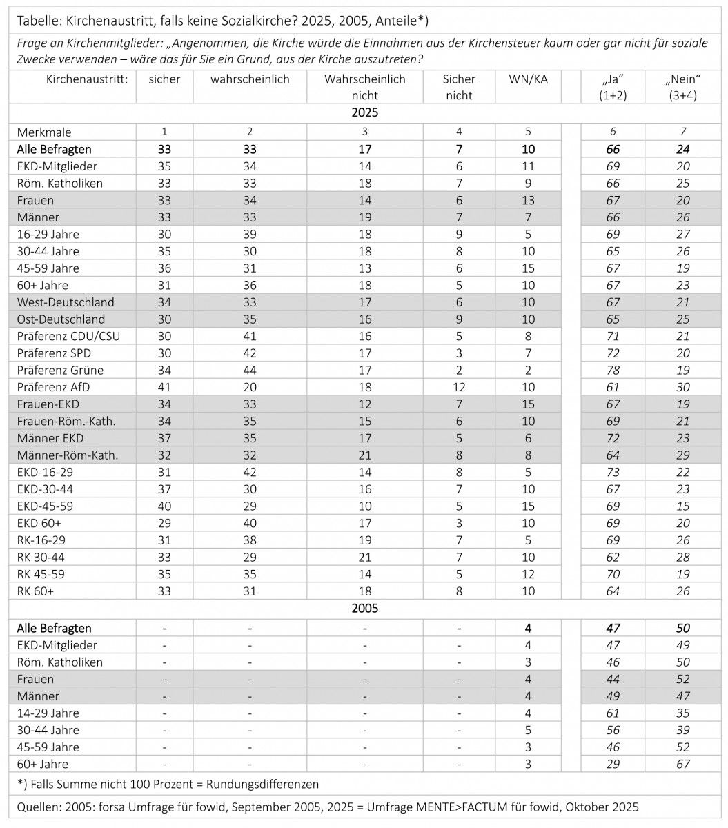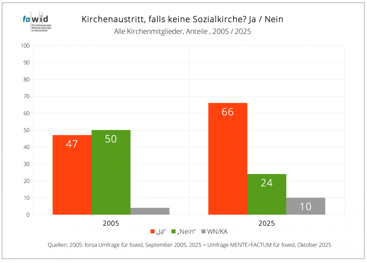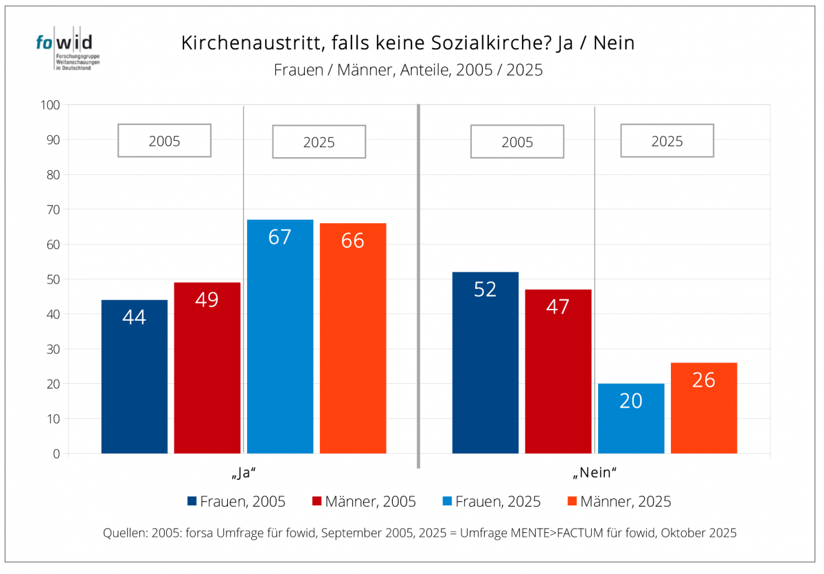 2005 meinten 44 Prozent der Frauen, die Kirche im Falle einer zu geringen Finanzierung der sozialen Einrichtungen aus Kirchengeldern verlassen zu wollen. 2025 sind es 67 Prozent, eine Veränderung von + 27 Prozentpunkten. Auch die Männer werden kritischer (49 zu 66 Prozent = + 17 Prozentpunkte), aber mit geringerer Veränderungsrate.