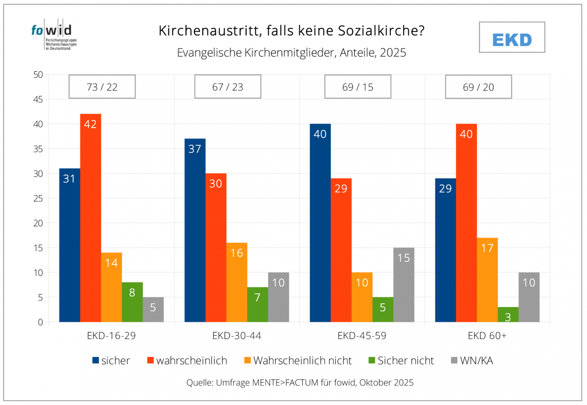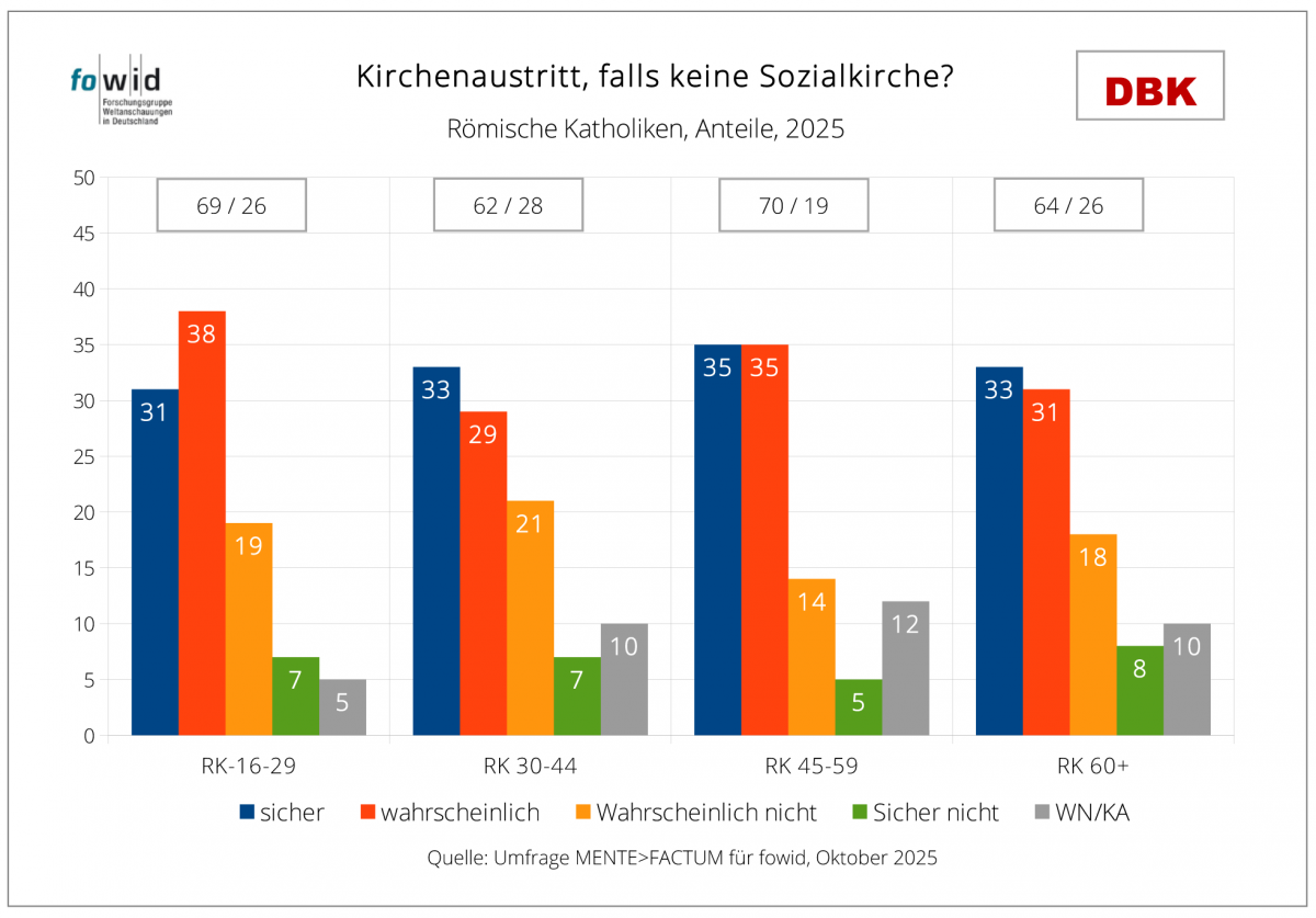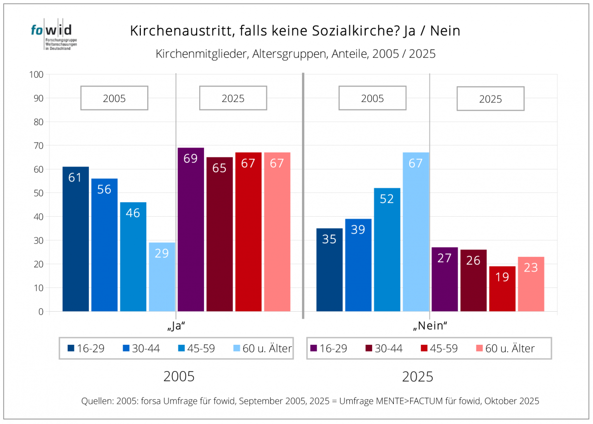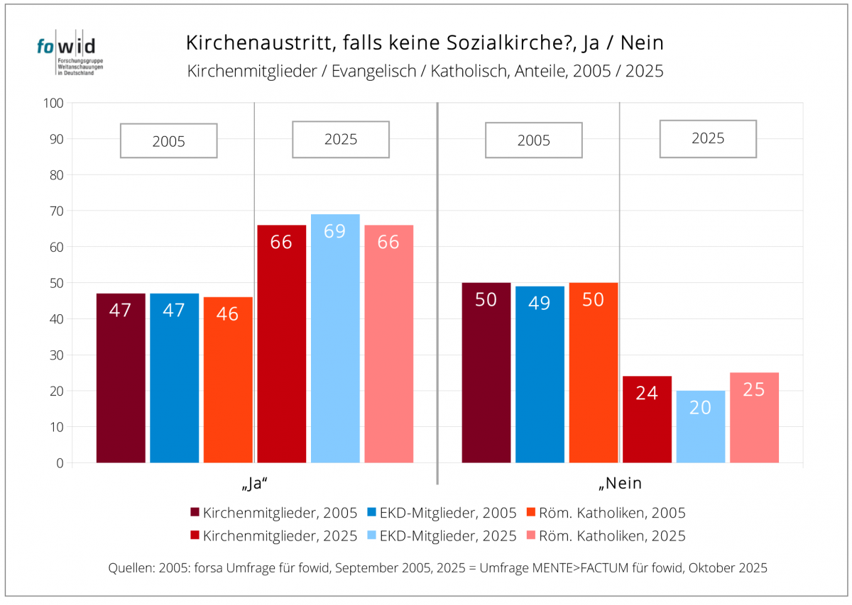 2005 meinten 44 Prozent der Frauen, die Kirche im Falle einer zu geringen Finanzierung der sozialen Einrichtungen aus Kirchengeldern verlassen zu wollen. 2025 sind es 67 Prozent, eine Veränderung von + 27 Prozentpunkten. Auch die Männer werden kritischer (49 zu 66 Prozent = + 17 Prozentpunkte), aber mit geringerer Veränderungsrate.