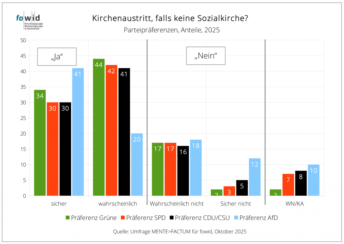 Der hohe Anteil der Parteianhänger der AfD (41 Prozent), die meinen, in einem solchen Fall „sicher“ auszutreten, relativiert sich bei einer Zusammenfassung der Reaktionen auf „Ja“ bzw. Nein:
