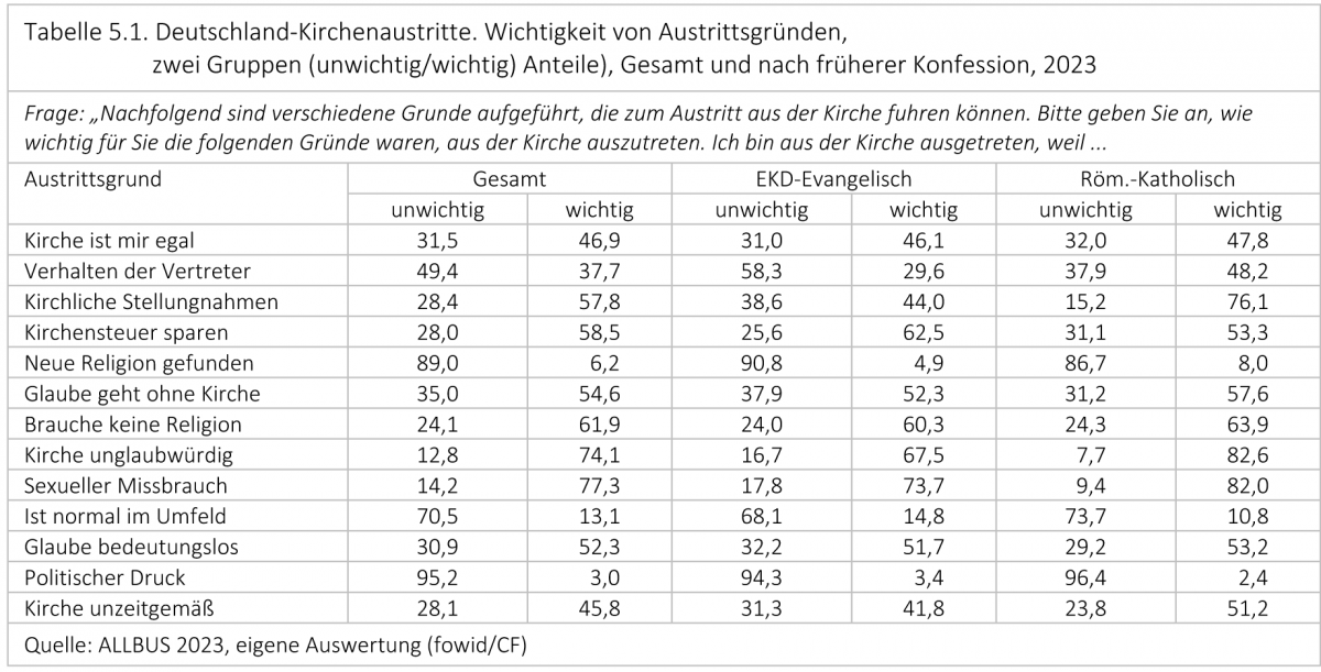 Drei Gründe werden von mehr als einem Dreiviertel der vormals römischen Katholiken als wichtige Gründe genannt: „… weil ich die Kirche unglaubwürdig finde“ (83 Prozent), „… weil sie Kinder und Schutzbedürftige nicht vor sexuellen Misshandlungen geschützt hat“ (82 Prozent) und „… weil ich mich über die kirchlichen Stellungnahmen geärgert habe.“ (76 Prozent). Der Zusammenhang dieser drei Gründe erscheint offensichtlich und fokussiert auf die Kommunikationsprobleme der Kleriker. Auf den Rangplätzen vier und fünf folgen dann die Gründe: „… weil ich in meinem Leben keine Religion brauche“ (64 Prozent) und „… weil ich auch ohne Kirche glauben kann“ (58 Prozent).