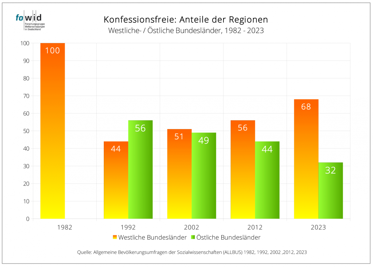 Allerdings ist der Anteil der Konfessionsfreien in den östlichen Bundesländern (2023: 32 Prozent) immer noch höher als der Bevölkerungsanteil der Bundesländer (rund 19 Prozent).