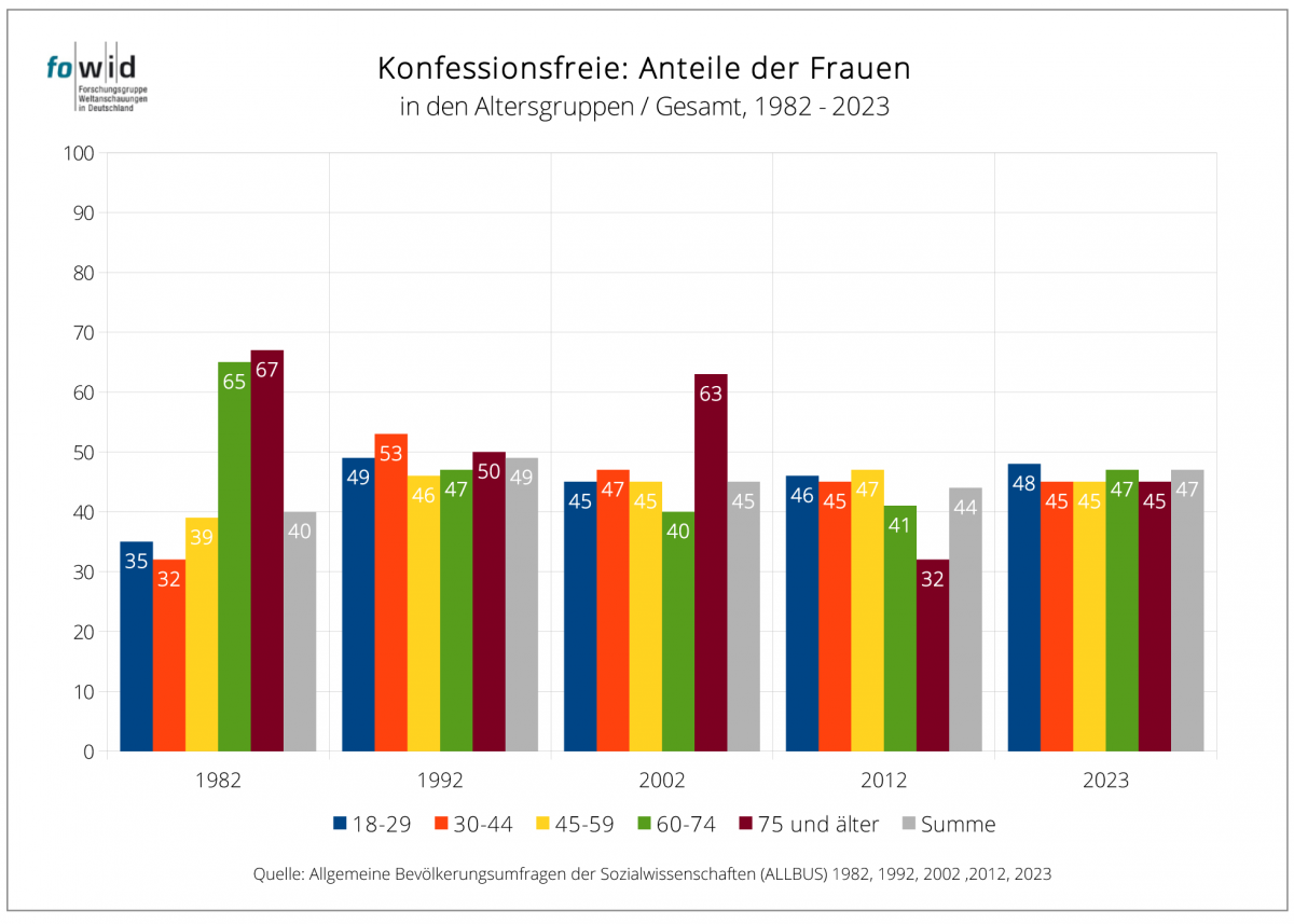 Innerhalb der Konfessionsfreien verändern sich die Anteile der Frauen – mit größerer Anzahl und Anteilen – zugunsten der Älteren, worin sich auch der Kohorteneffekt der Altersverschiebungen auf der Zeitachse darstellt.