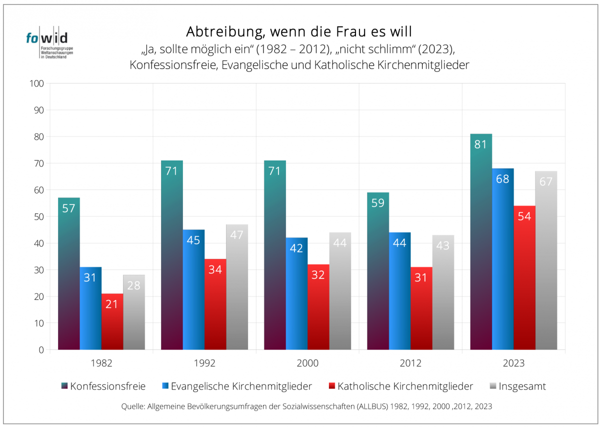 Die Kirchenmitglieder könne sich diesem Trend zwar auch nicht entziehen, sind dabei aber deutlich verhaltener. Vor allem die Katholiken sehen das restriktiver – was der Haltung des frischgewählten Papstes Leo XIV. entspricht, der sich in einer seiner ersten Erklärungen gegen die Möglichkeit der Abtreibung ausgesprochen hat. („Papst Leo XIV.: Erste Positionen zu Frieden, Frauen, Missbrauch, KI und Migration.“)