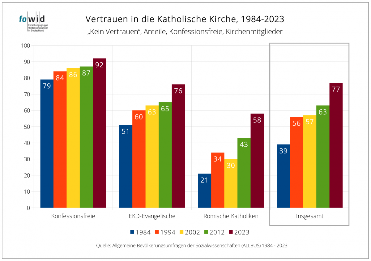 Bei den Konfessionsfreien zeigt sich die Sichtweise, kein Vertrauen in die Kirchen zu haben, durchgängig ansteigend und parallel für beide Kirchen, wobei sich der Abstand der negativen Bewertungen verkleinert: 1984 waren es 66:79, also 13 Prozentpunkte Differenz, 2023 sind es 84:92, also 8 Prozentpunkte Unterschied. (Tabelle 11)