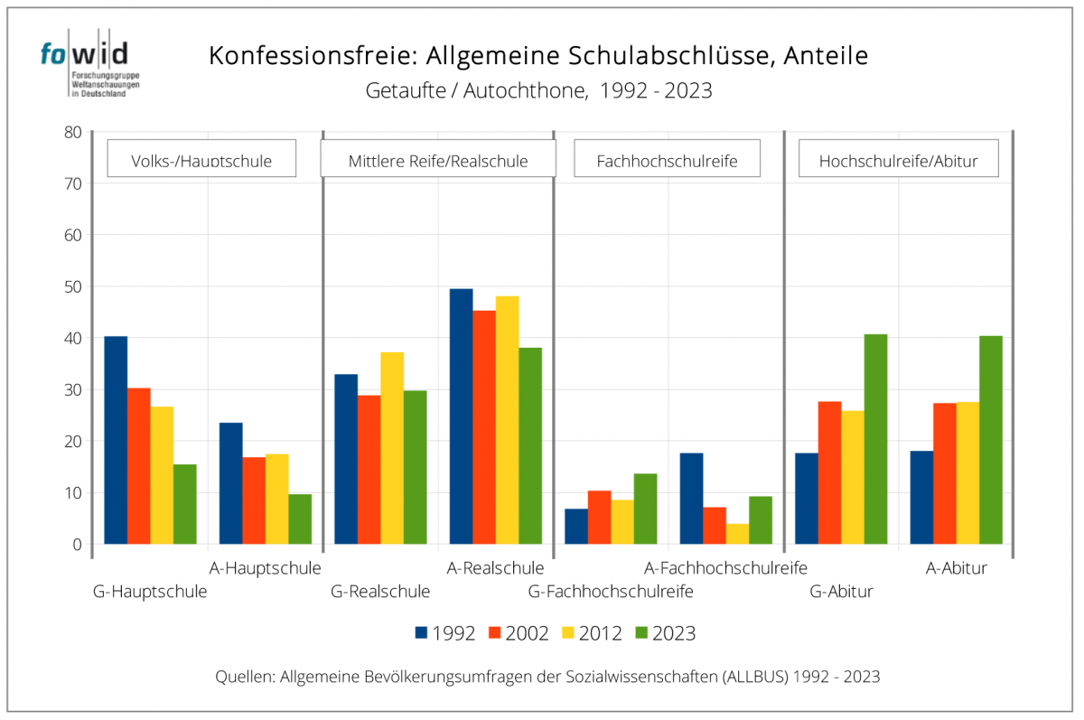 Die einzigen Unterschiede zeigen sich darin, dass die ehemaligen Kirchenmitglieder (G) etwas höhere Anteile mit Hauptschulabschluss haben und die Autochthonen (A) höhere Anteile bei der Mittleren Reife / Realschulabschluss. Bei der Hochschulreife / Abitur sind die Anteile für beide Merkmale identisch.