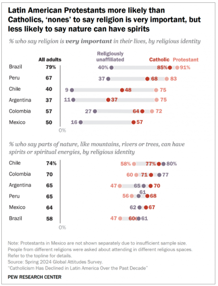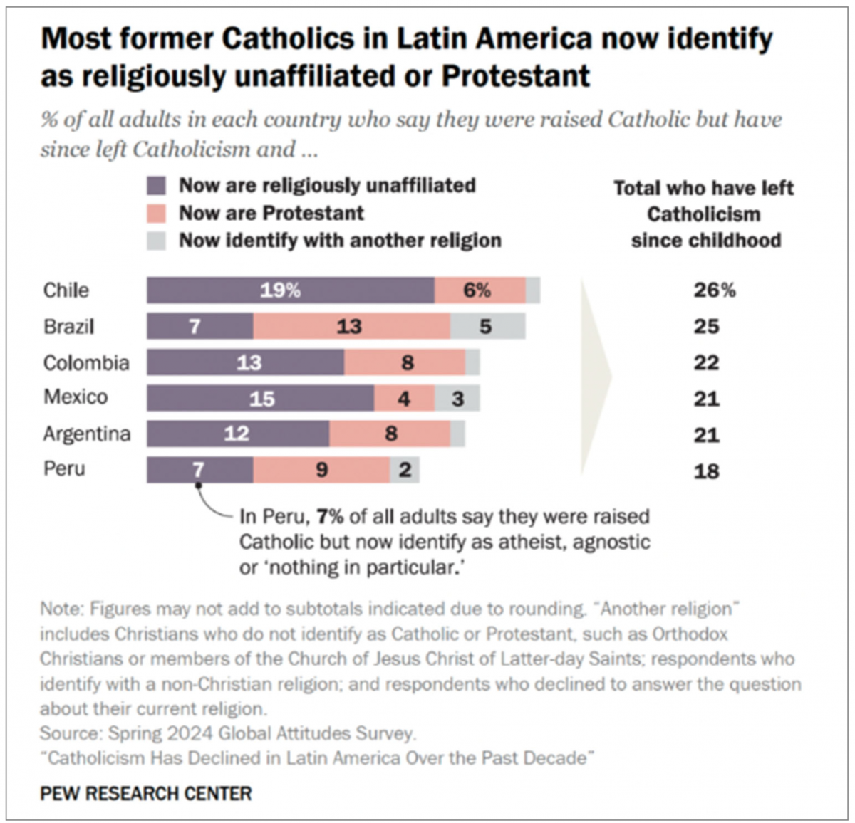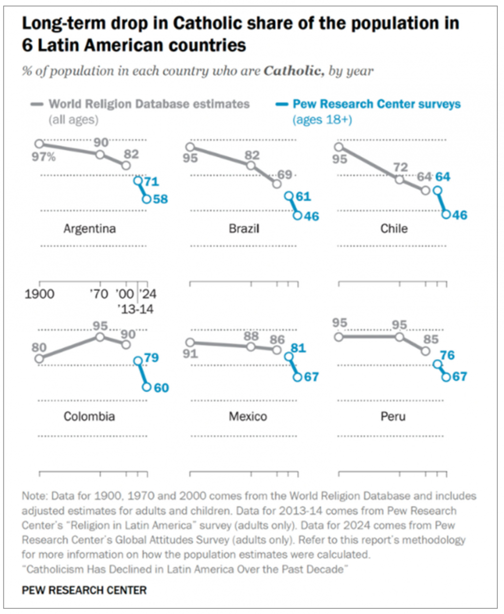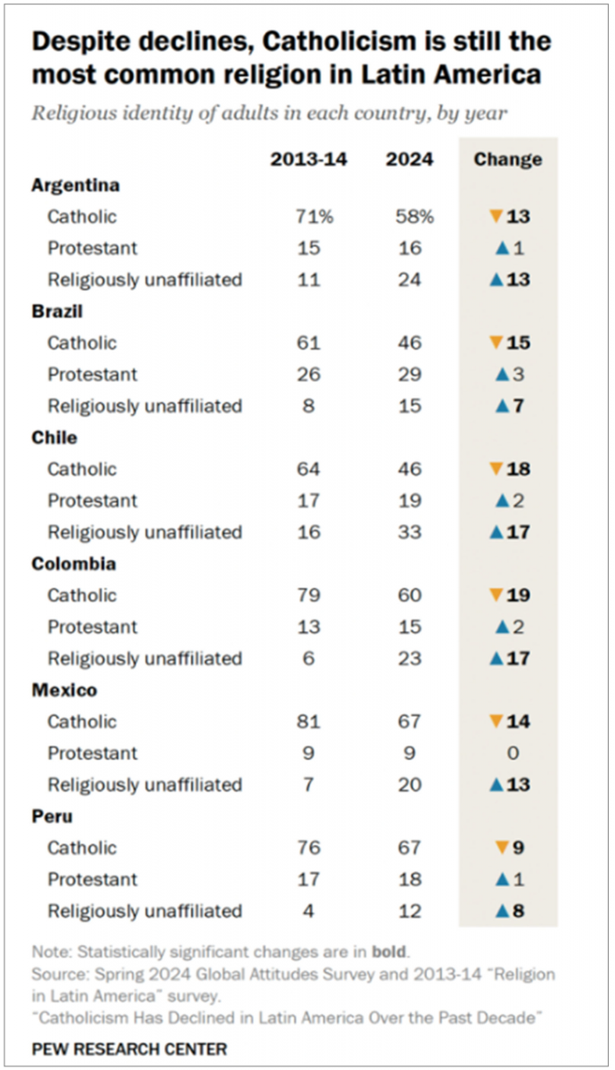 2013/14 „hatten Argentinien, Brasilien, Chile, Kolumbien, Mexiko und Peru noch alle katholische Mehrheiten, wobei etwa sechs von zehn oder mehr Erwachsenen in jedem Land sich als katholisch identifizierten. Heute [2024] identifizieren sich etwa die Hälfte der Brasilianer und Chilenen als katholisch (jeweils 46 %), während Argentinien (58 %), Kolumbien (60 %), Mexiko (67 %) und Peru (67 %) deutlich kleinere katholische Mehrheiten haben als 2013/14.“