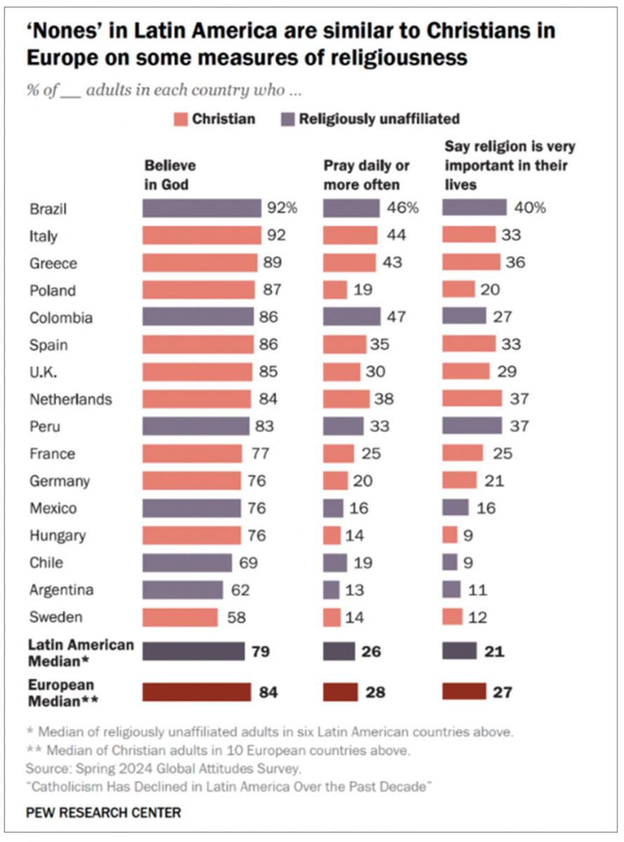 Auf eine Besonderheit gehen die PEW-Umfragen detailliert ein: die Religiosität der Konfessionsfreien: „Wir verglichen religiös nicht zugehörige Menschen in Lateinamerika mit Christen in Europa an drei Kriterien: Glauben an Gott, Gebetshäufigkeit und ob Menschen Religion für sehr wichtig in ihrem Leben halten. Nach diesen Maßstäben sind „Nones“ in Lateinamerika im Durchschnitt etwa so religiös wie Christen in Europa.“