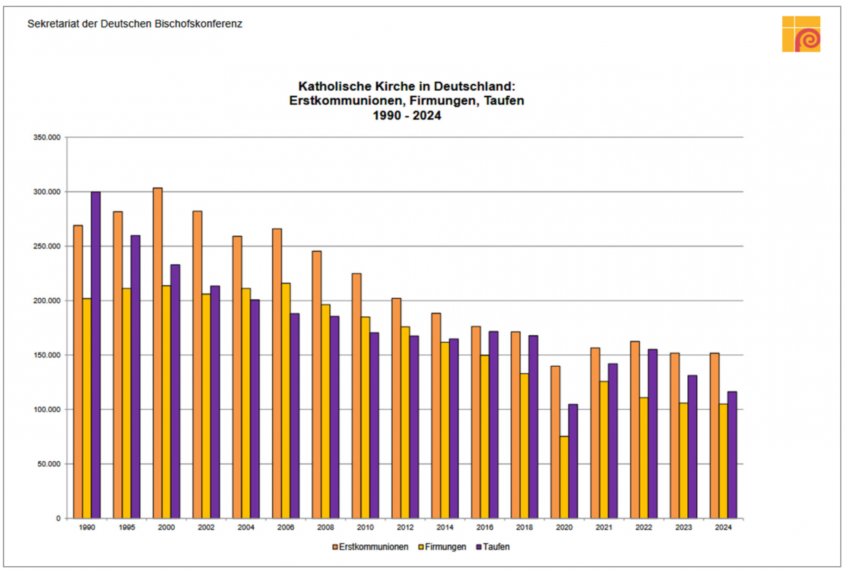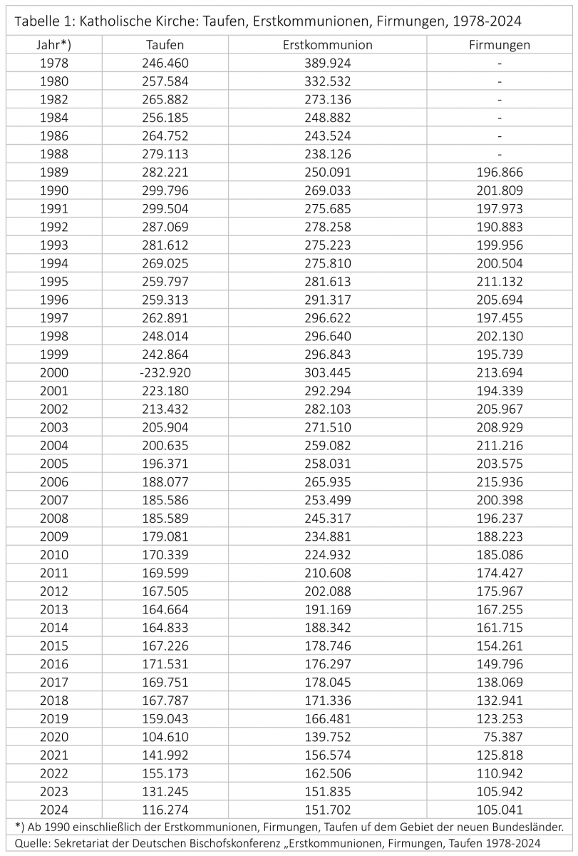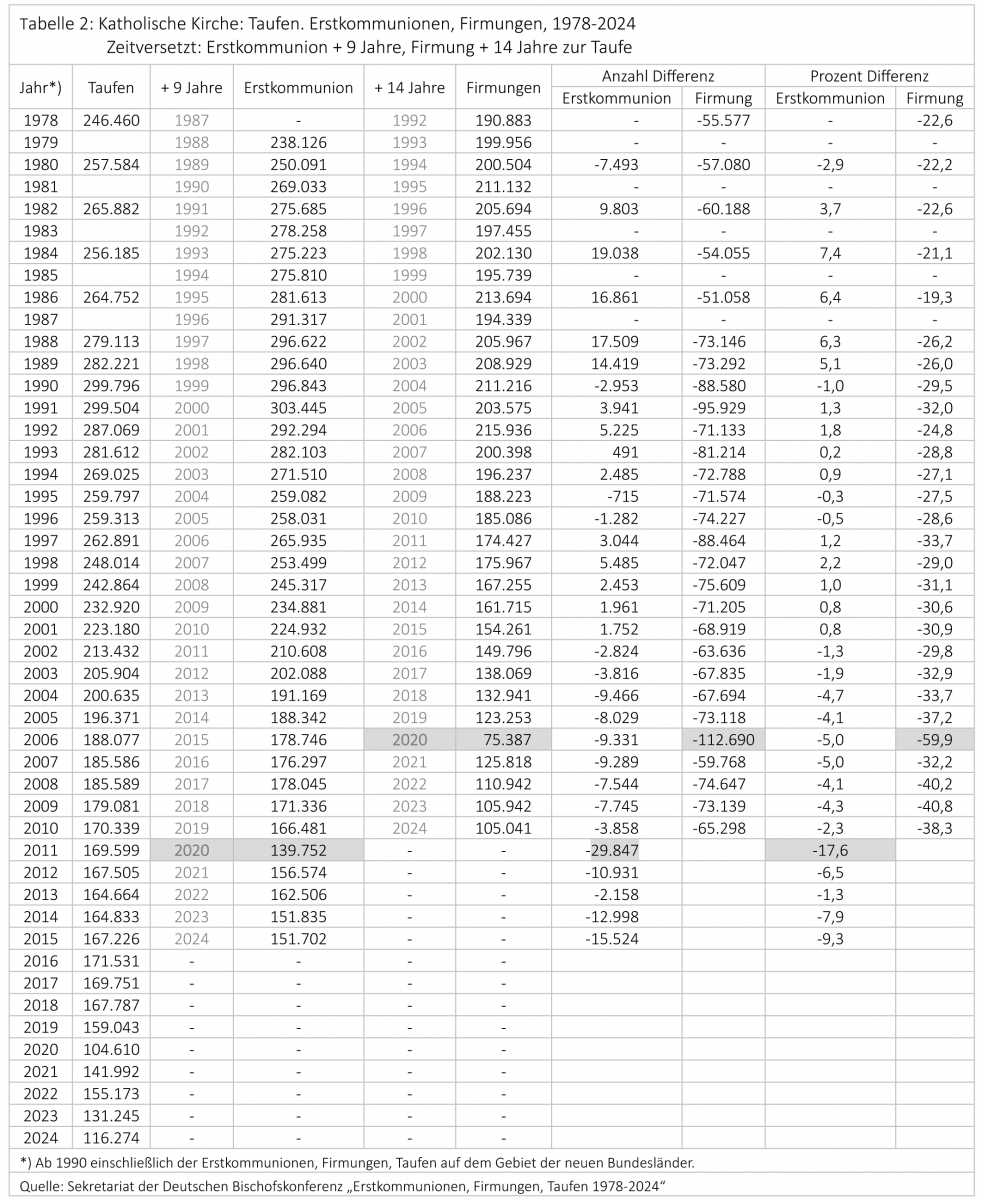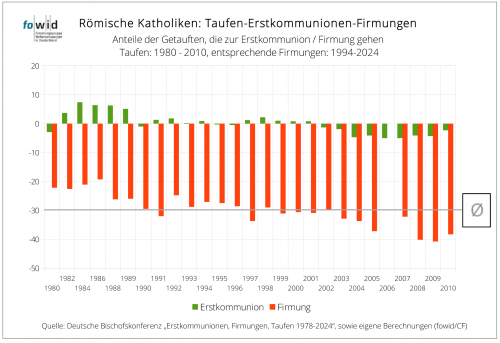 Nach dem katholischen Kirchenrecht werden Jugendliche mit 14 Jahren „kirchenmündig“, d. h. sie gelten als Erwachsene. Das findet theologisch/sakral seine Initiation in der „Firmung“. Folglich wird ein getaufter Katholik erst mit der Firmung ein verantwortliches Kirchenmitglied. Rund ein Drittel der jugendlichen römischen Katholiken haben 1994-2024 nicht an der Firmung teilgenommen und sind somit keine Kirchenmitglieder (mehr).