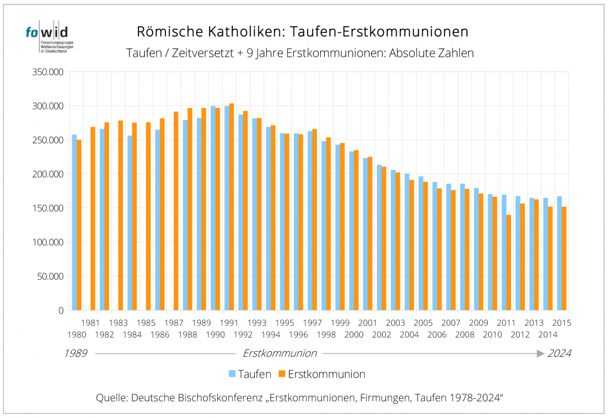 Sie suggerieren zum einen eine Parallelität der Veränderung und sind zum anderen falsch, da sie Ereignisse nebeneinanderstellen, die um 9 bzw. 14 Jahre voneinander entfernt sind und entsprechend andere Voraussetzungen haben. Das führt zu dem Ergebnis, dass z. B. in der Darstellung für die Jahre 1995 – 2024 die Anzahl der Erstkommunionen höher sind als die Anzahl der Taufen, was sachlich und methodisch nicht korrekt ist.