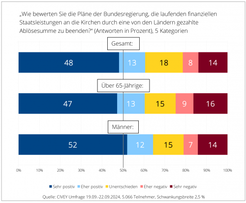 Fowid-Notiz: In einer aktuellen CIVEY-Umfrage (19.-21.09.2024) sieht die Mehrheit der Teilnehmerinnen und Teilnehmer (61 Prozent) die Pläne der Bundesregierung positiv, die laufenden finanziellen Staatsleistungen an die Kirchen durch eine von den Ländern gezahlte Ablösesumme zu beenden.
