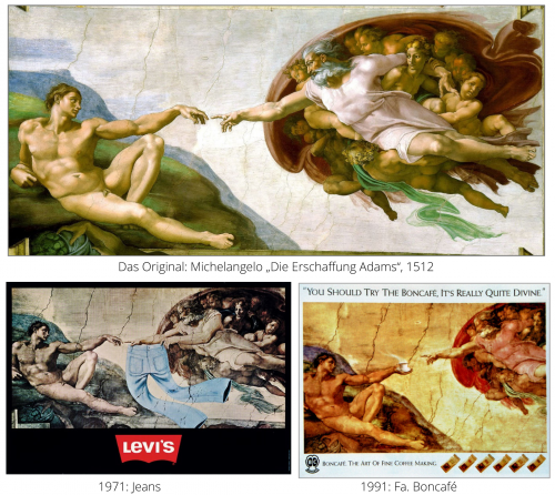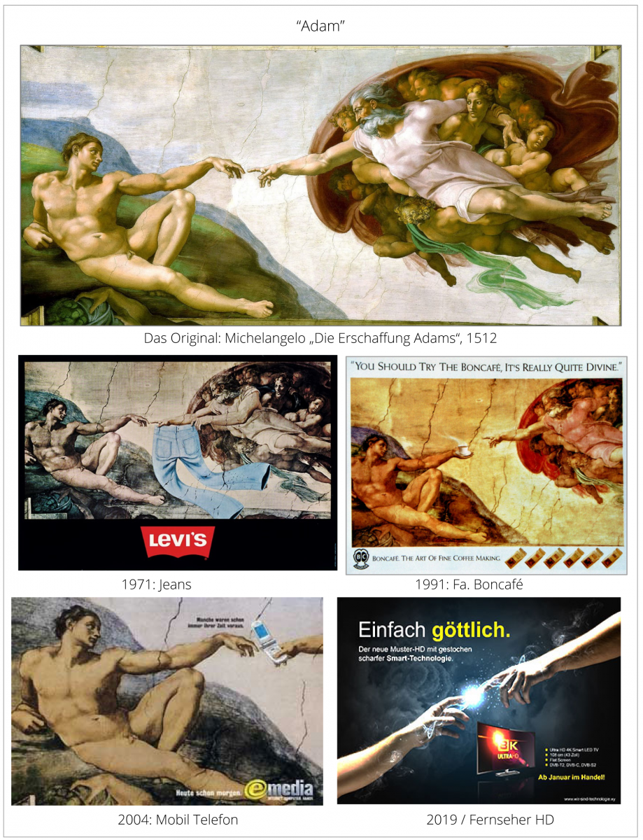 - Khomasuridze, Nato: „Christliche Kunst in der Werbung. Werbung als Ersatzreligion am Beispiel „Die Erschaffung Adams“ in der Werbung“. GRIN, 2012, 26 Seiten.