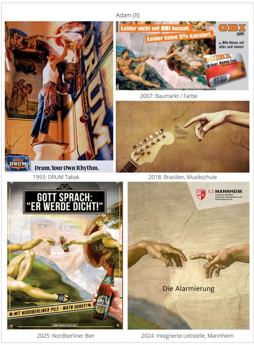 Ebenso die beim „Abendmahl“, bei dem nicht auf die biblische Erzählung allgemein, sondern auf eine spezielle bildliche Ausführung Bezug genommen wird (Gemälde von Leonardo da Vinci in Mailand), gilt dies auch für „Adam“ (die „Erschaffung Adams“), bei dem das Deckenfresko in der Sixtinischen Kapelle von Michelangelo Bezug ist.