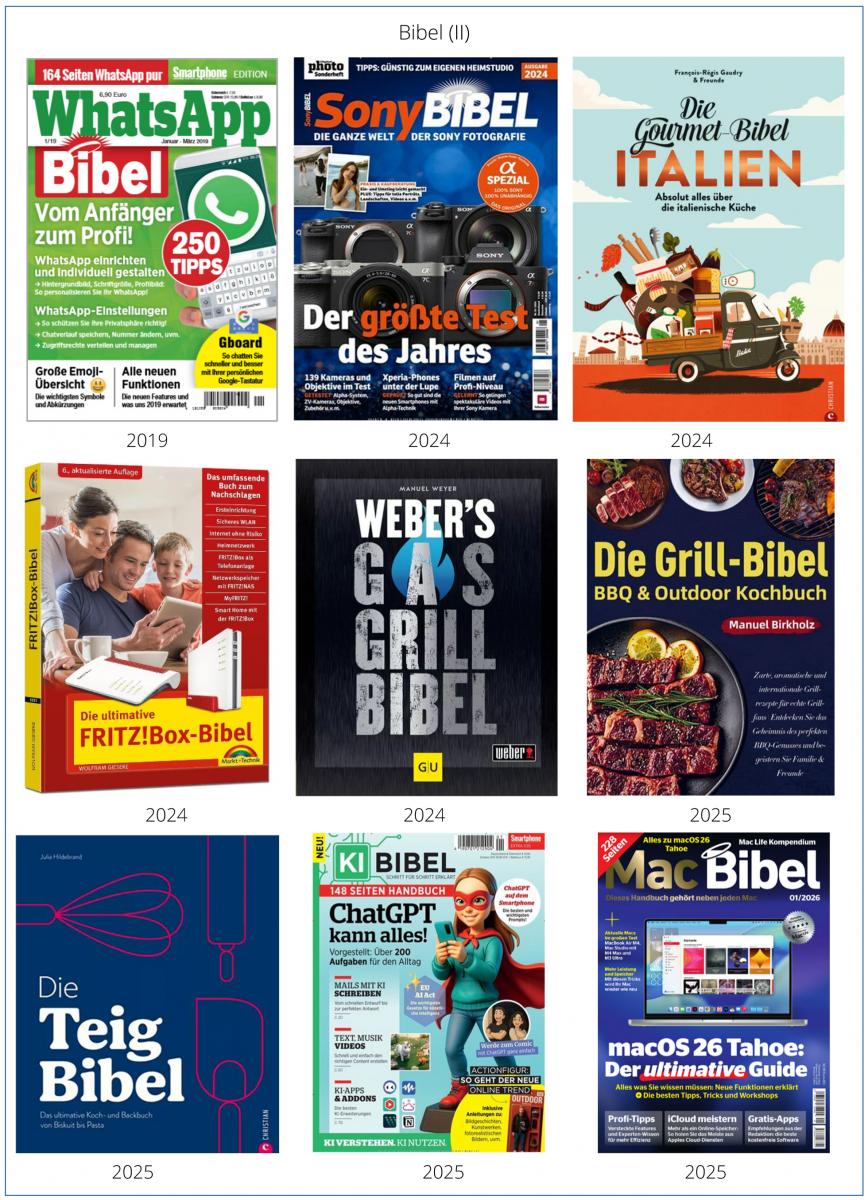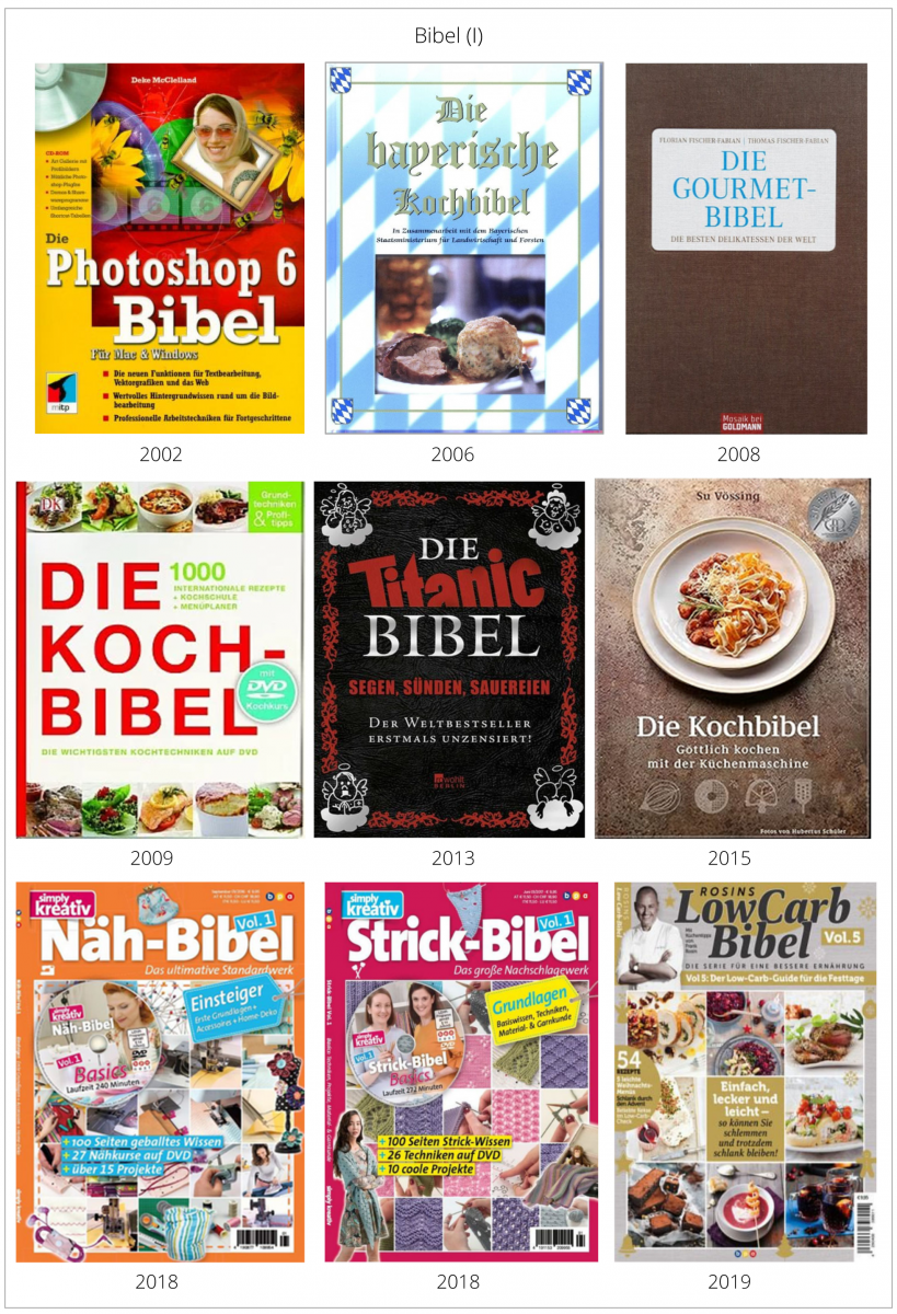 Die nicht-repräsentative Auswahl von nicht-religiösen Bibeln („Buch der Bücher“) zeigt die Schwerpunkte der neuen Bibeln/Religionen: die Hälfte (9) handeln von Küche/Kochen/Essen, ein Drittel (6) von IT-Technik/Internet und (3) von Nähen/Stricken/“Sauereien“.