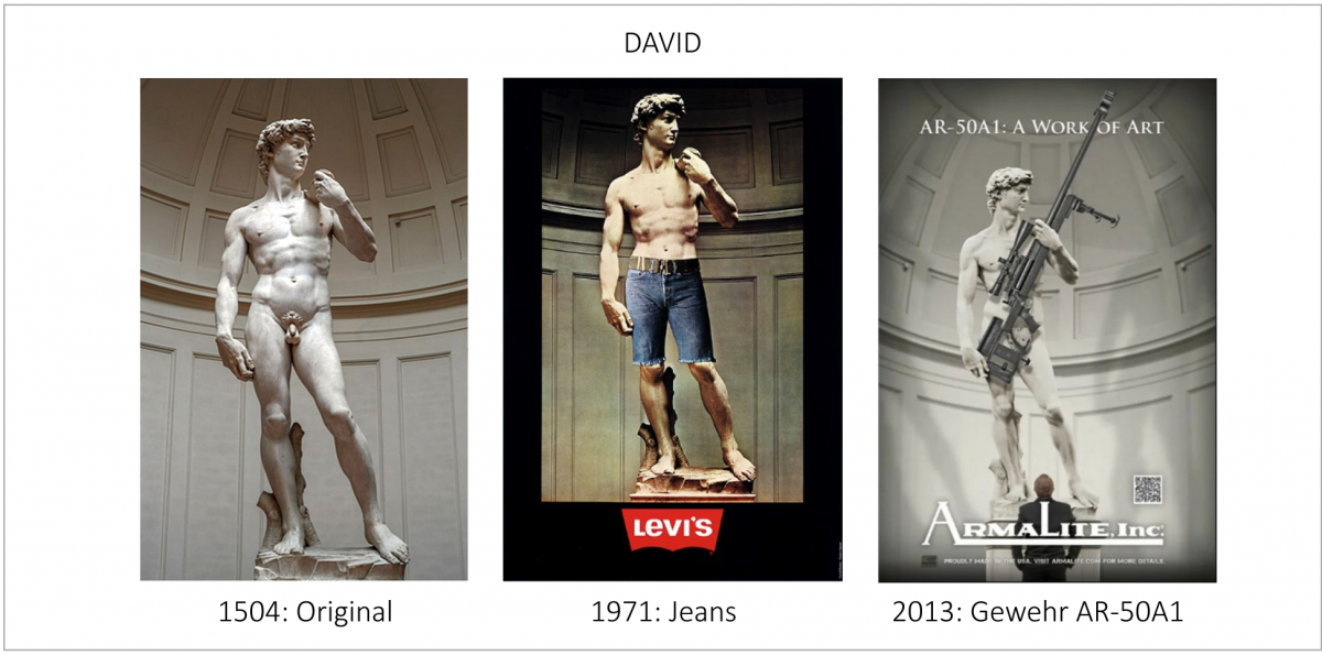 Auch dem David liegt ein spezielles ‚Kunststück‘ - eine Statue - zugrunde, der „David“ von Michelangelo in Florenz. Von zwei US-Firmen bekommt er Hosen an und wird bewaffnet.