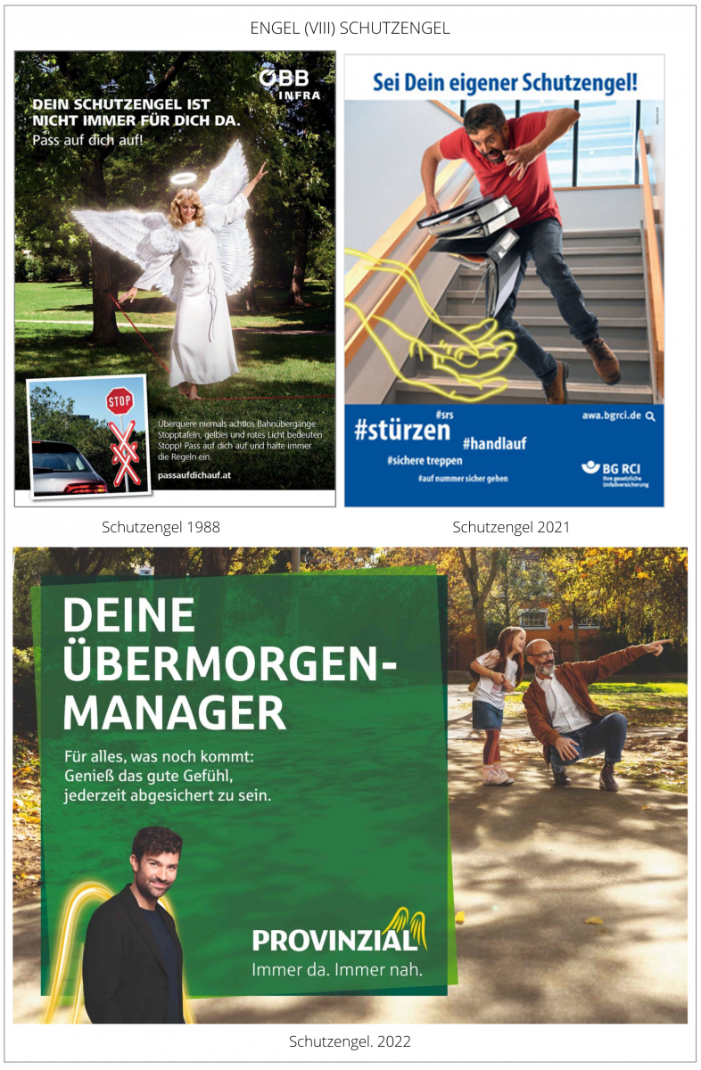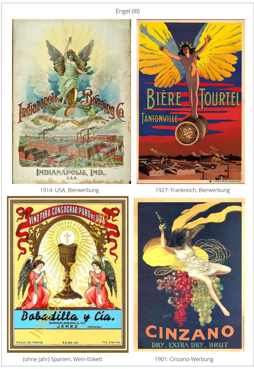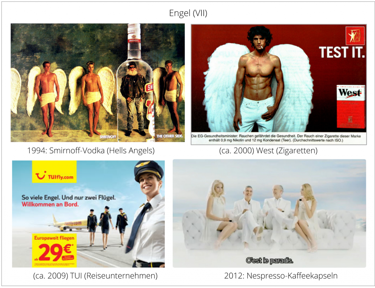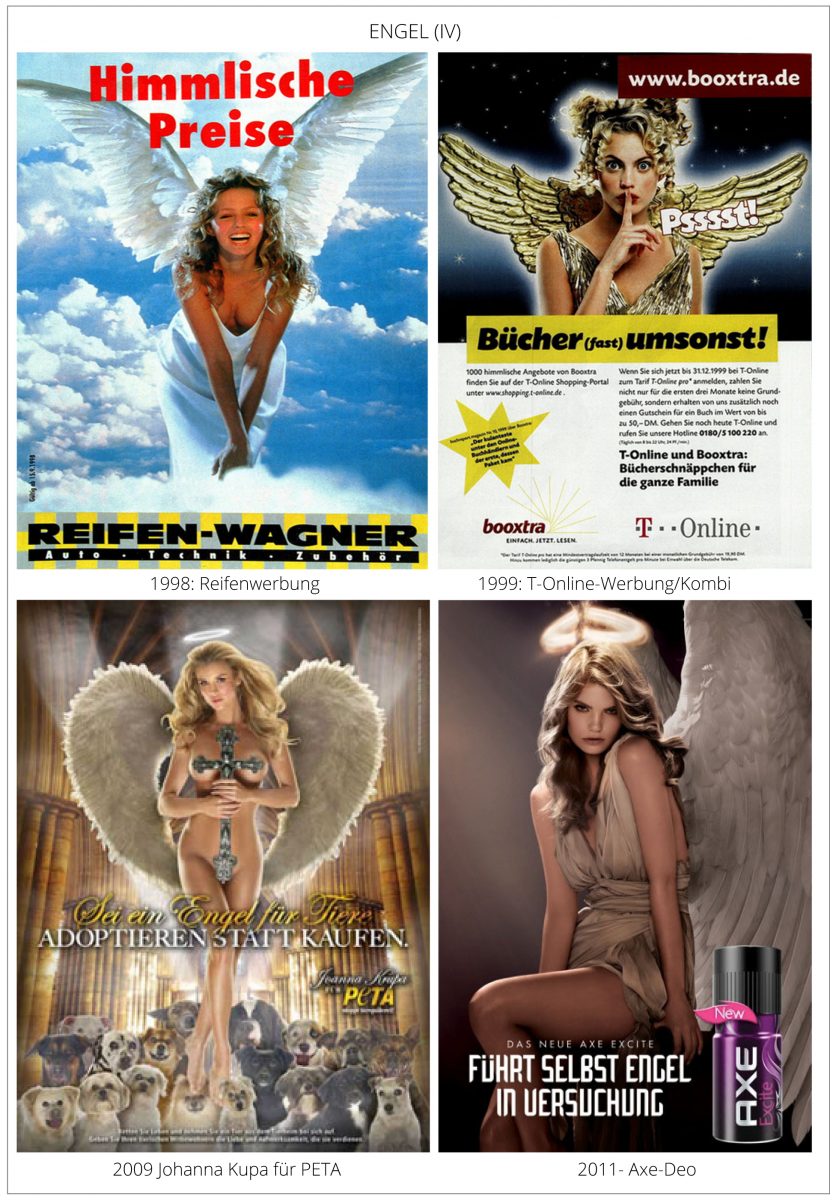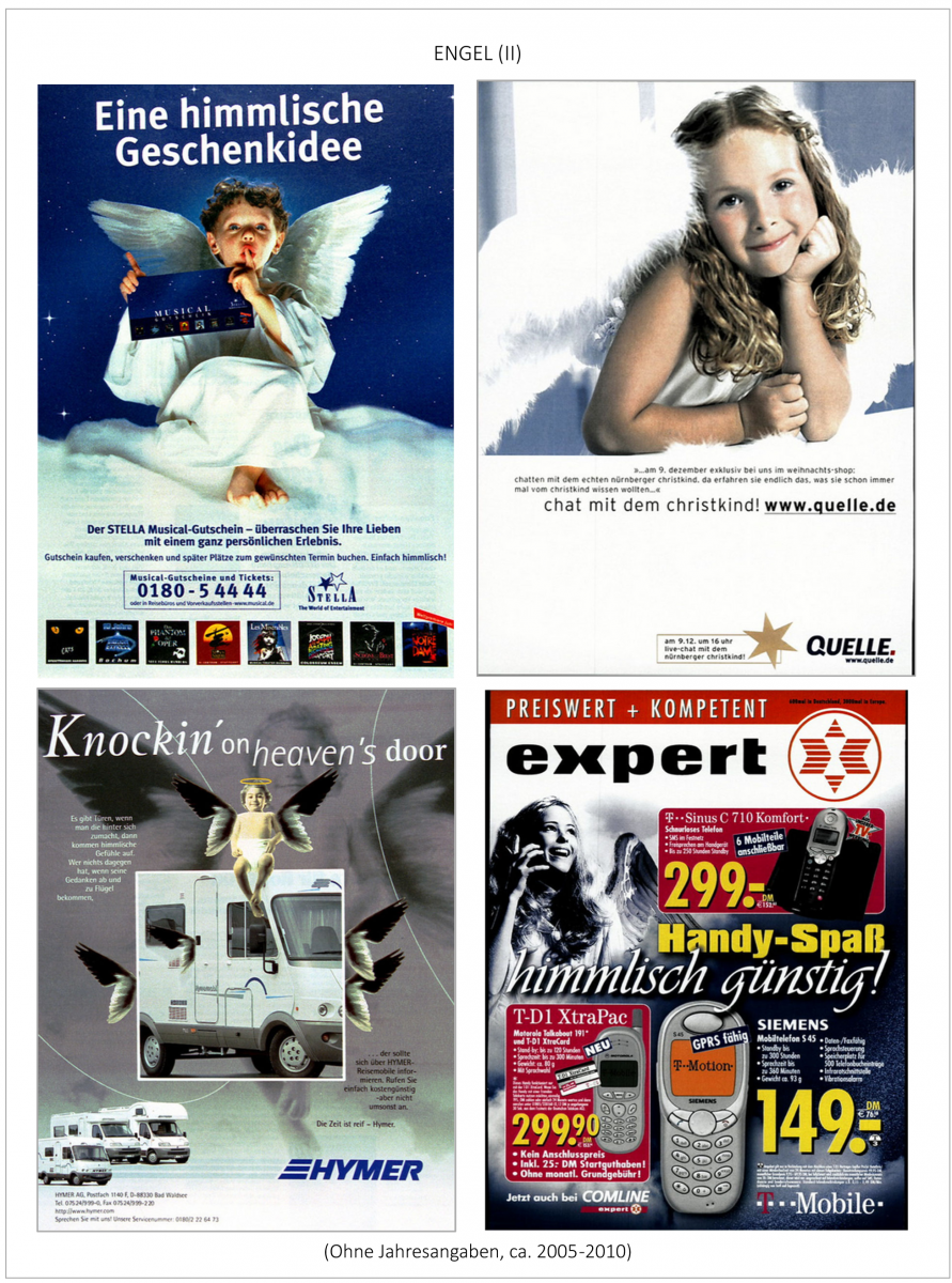 Für die Engel der Werbung wird das ganze Repertoire an Möglichkeiten dargestellt: als Kinder (Putten), weiblich – dezent, offenherzig bis erotisch – und Schutzengel, weiblich wie männlich.