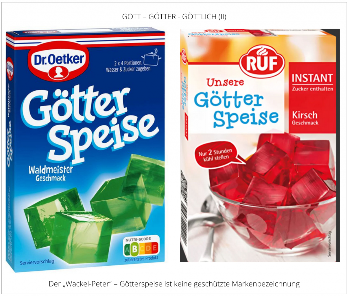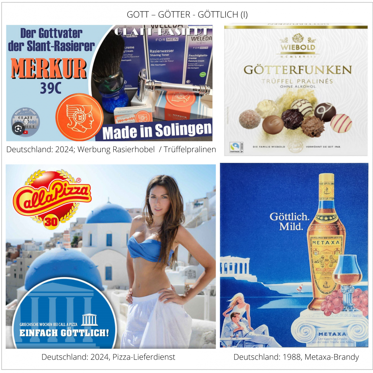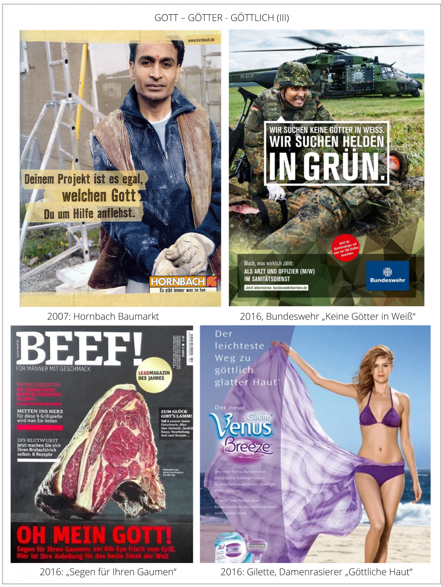 „Gott“ bleibt kommerziell unscheinbar – bleibt Wort – was der christlichen Ikonographie entspricht, in der er in „Adams Erschaffung“ dargestellt wird – populär häufig als alter Mann mit Bart. „Göttlich“ findet dagegen verschiedentlichste Verwendung.