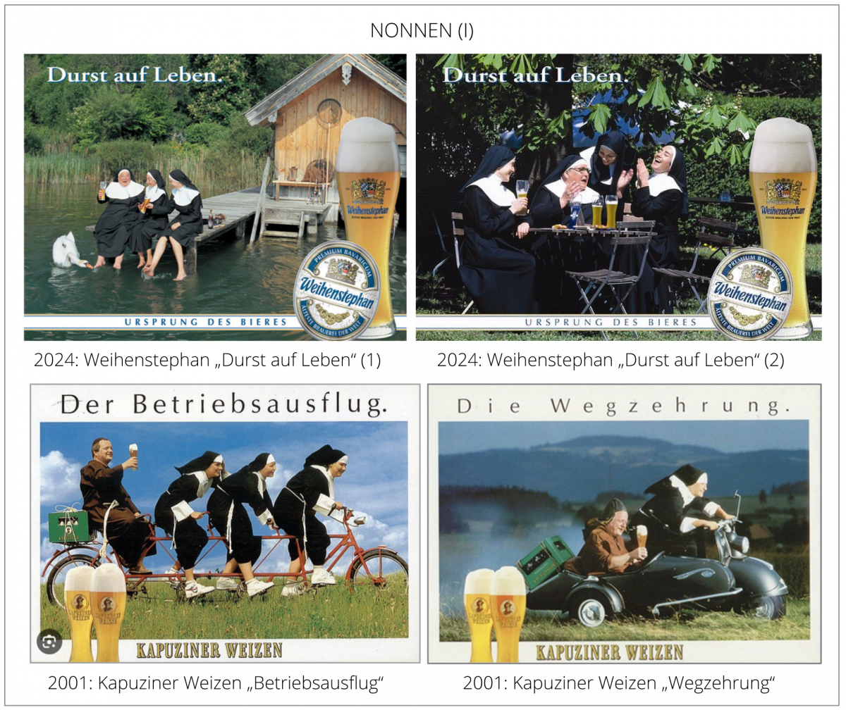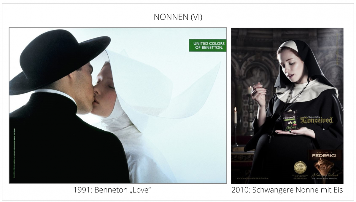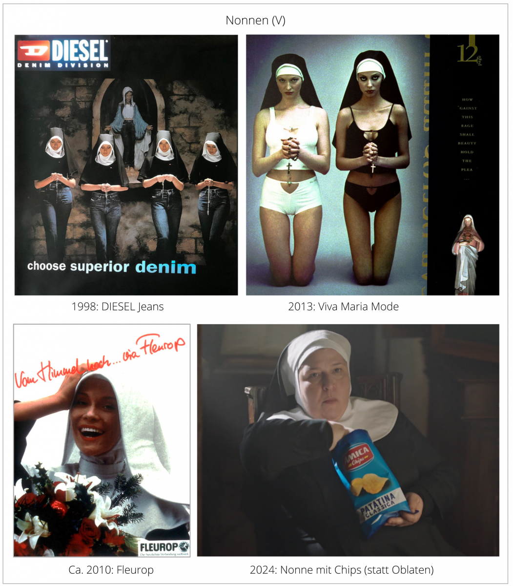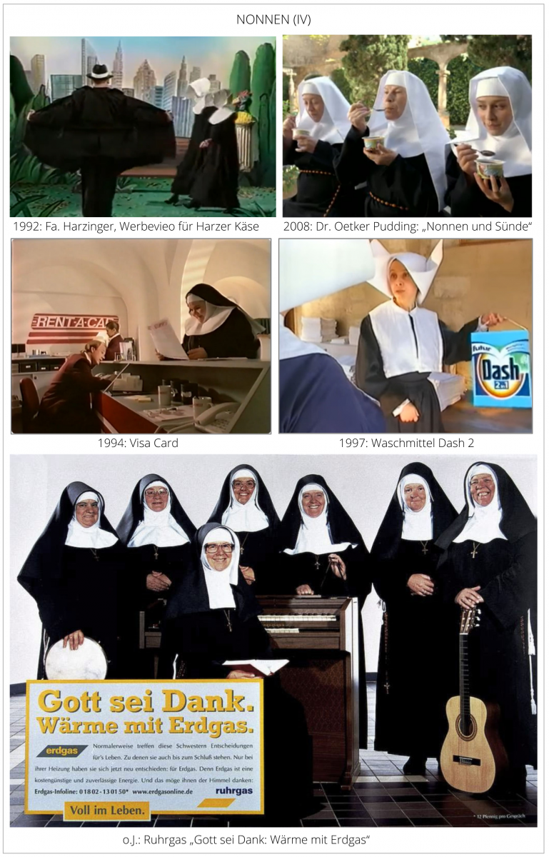 Die Verwendung von Nonnen in der kommerziellen Werbung ist vergleichbar vielfältig, wie die der Engel – so ziemlich alles ist möglich.