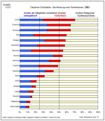 In den ausgewählten 18 deutschen Großstädten befinden sich in der Hälfte der dargestellten Städte (9) die evangelischen und römisch-katholischen Kirchenmitglieder in der Minderheit. Neben allen Großstädten in den Neuen Bundesländern - in denen der Anteil der Kirchenmitglieder zwischen 12 bis 21 Prozent der Bevölkerung beträgt - sind es auch Hamburg und Frankfurt, in denen die christlichen Kirchenmitglieder im Jahr 2003 nicht mehr die Mehrheit der Bevölkerung darstellen.